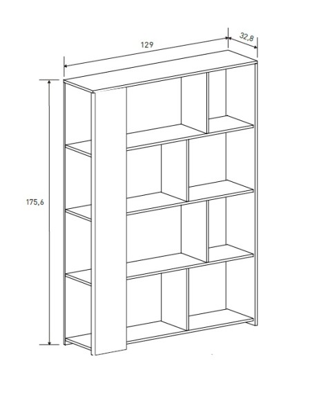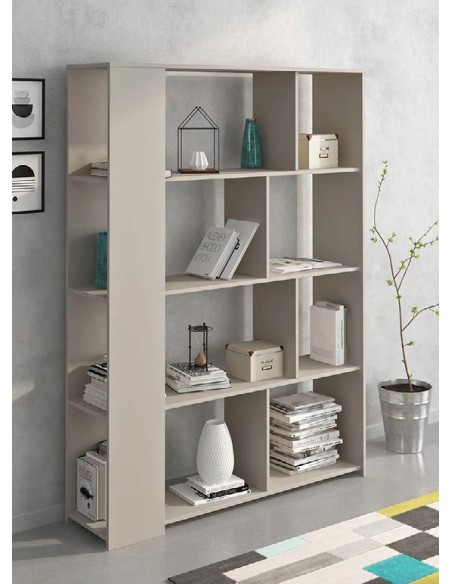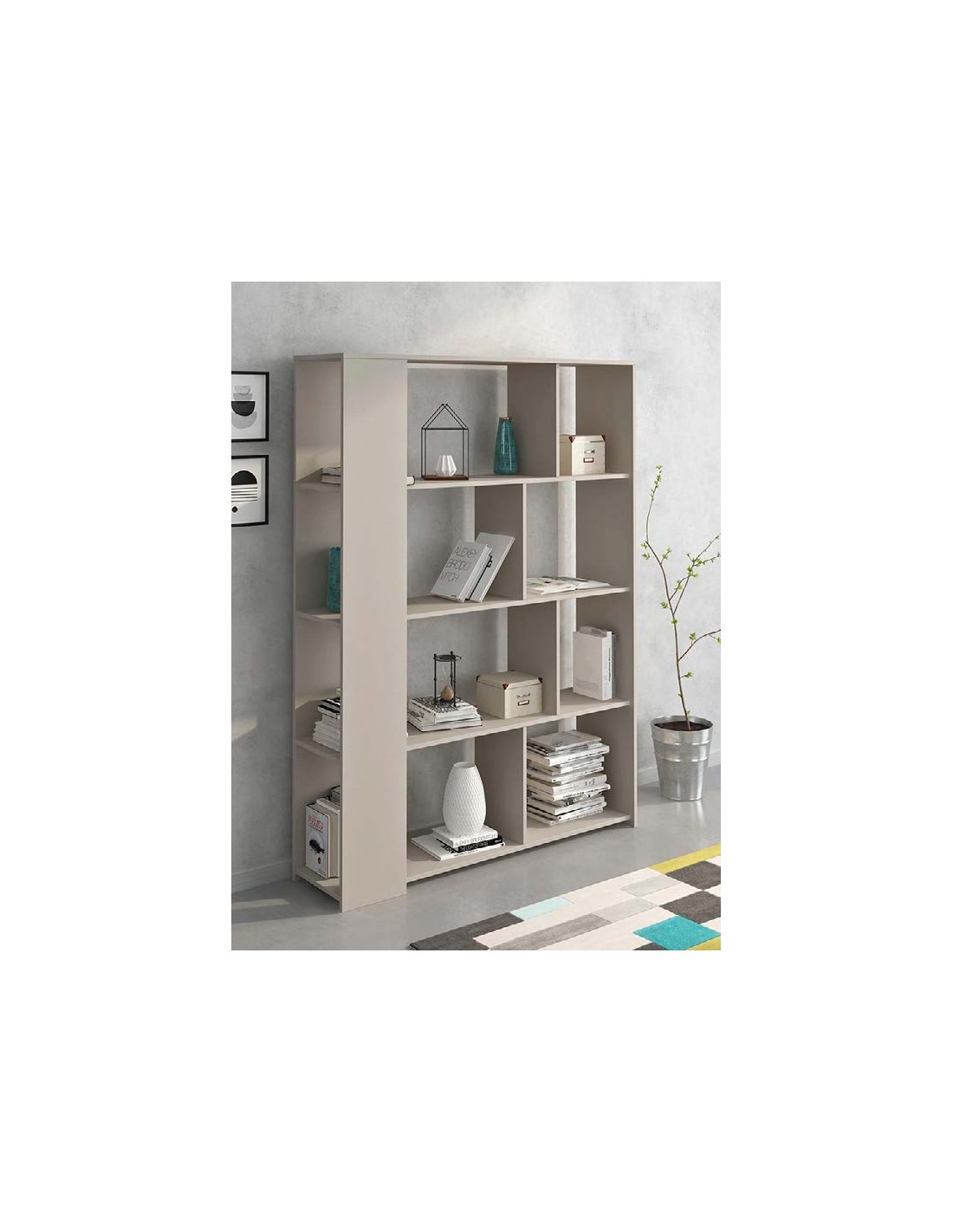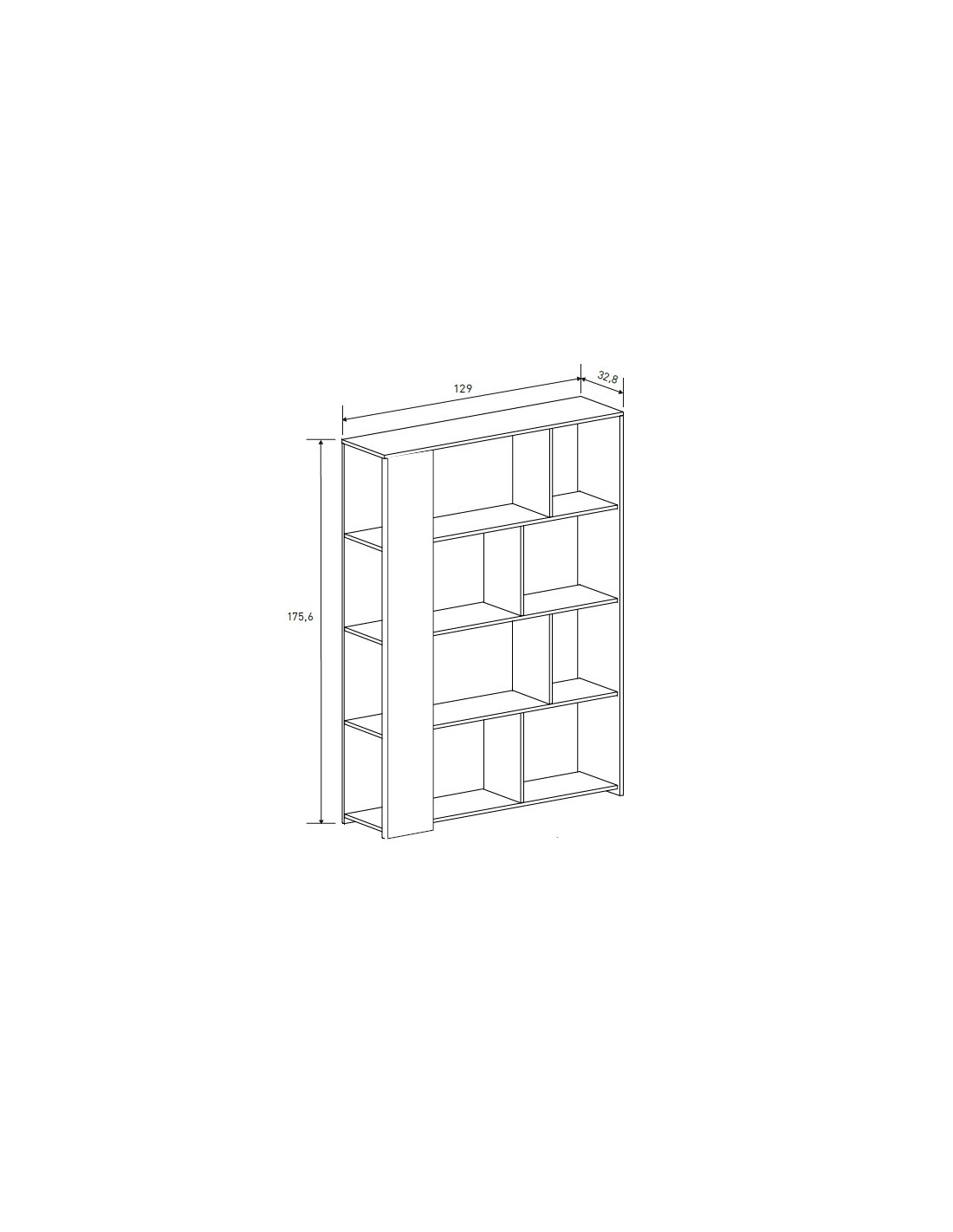 Estantería de diseño moderno, con separadores de estantes asimétricos. Su medida es 129 cm de ancho y 174 cm de alto. La estantería está fabricada con tablero melamínico de alta calidad y herrajes metálicos. Disponible en 3 combinaciones de acabados.
