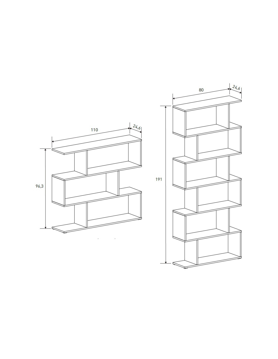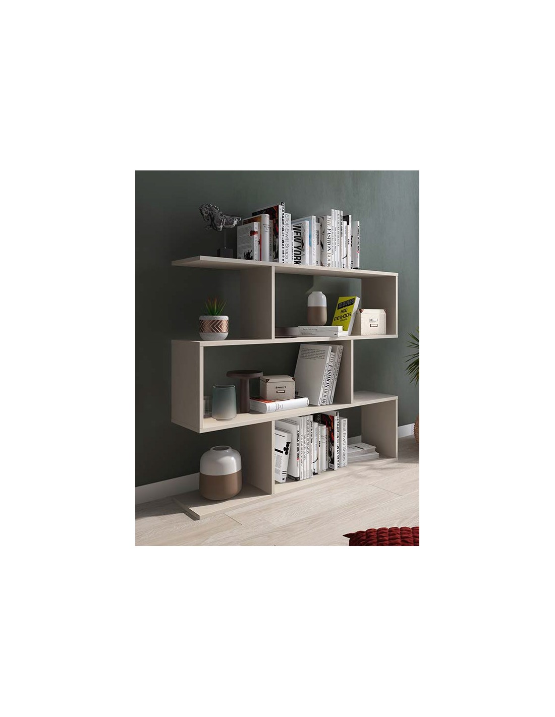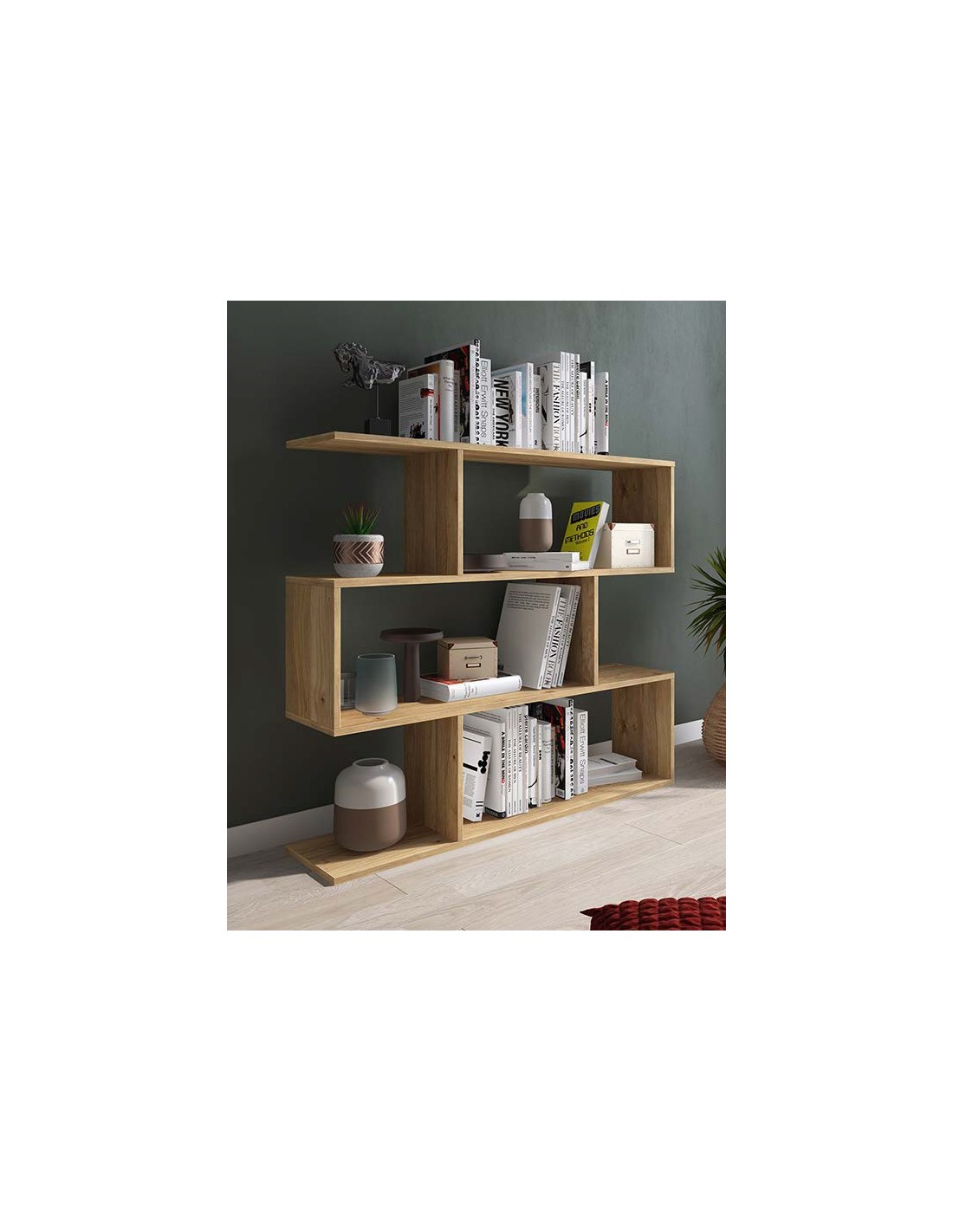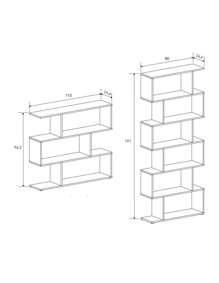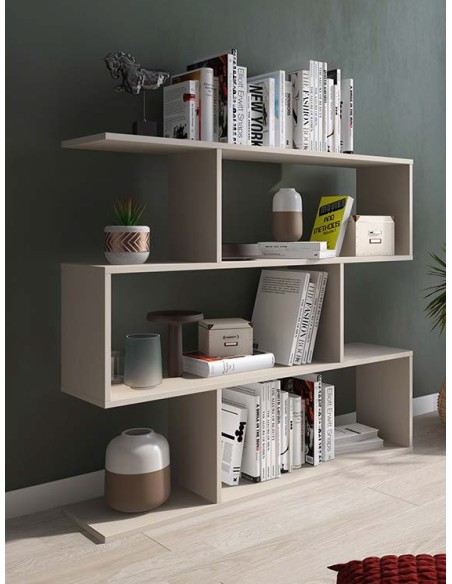 Estantería de diseño moderno, con separadores de estructura y estantes asimétricos. Dispone de dos medidas, alta y baja. La estantería está fabricada con tablero melamínico y herrajes metálicos.