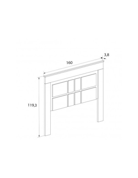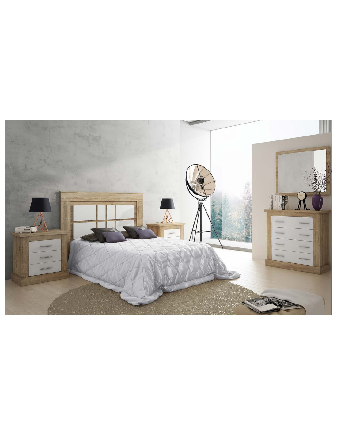 Dormitorio de matrimonio compuesto por: cabecero con patas y plafón de madera con piezas en relieve, dos mesitas con tres cajones cada una. Cómoda con cuatro cajones y espejo. Está fabricado con tablero de aglomerado con chapa sintetica y melaminizada (16 y 32mm), y herrajes metálicos. No se incluye colchón ni somier ni decoración, los cuales están disponibles en la sección descanso y decoración.
