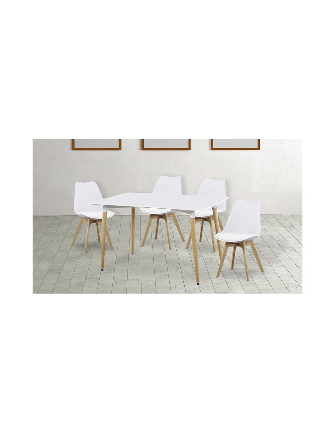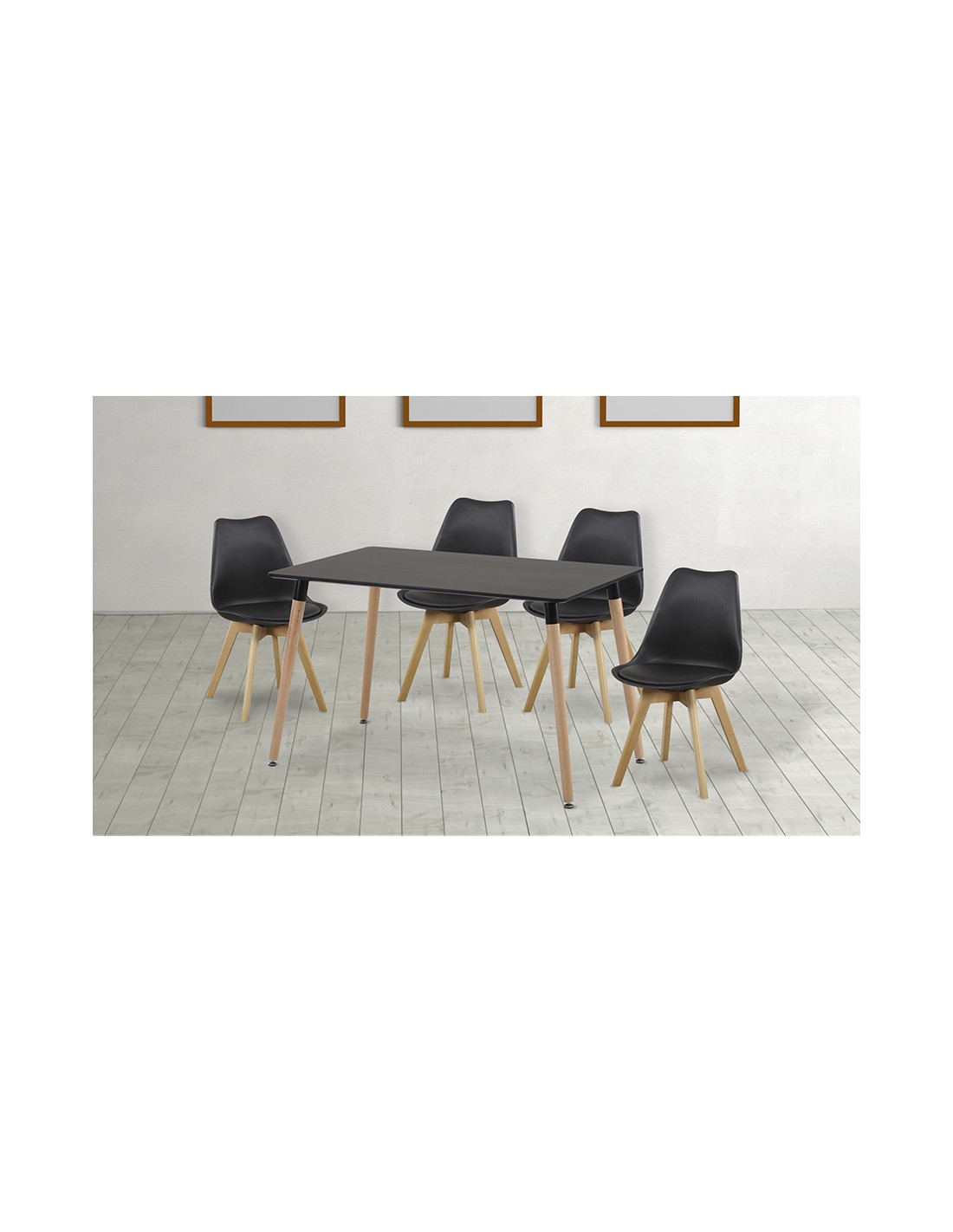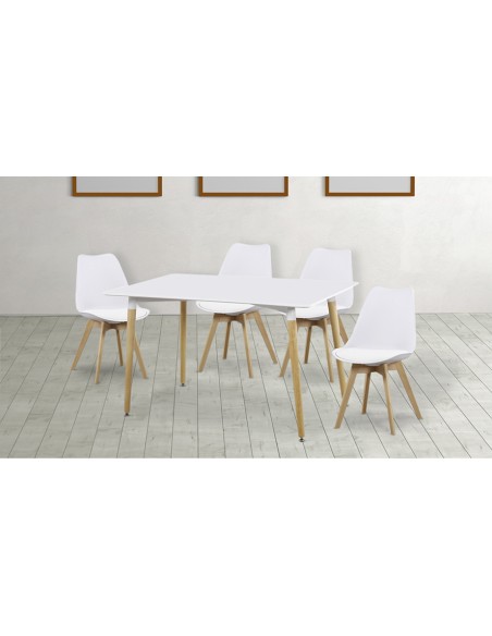 Conjunto de mesa rectangular acabada en DM negro y 4 sillas con asiento acolchado en polipiel y patas en madera. Excelente resistencia gracias a sus materiales, ideal para salones o cualquier otro ambiente. Disponible en color blanco y negro.