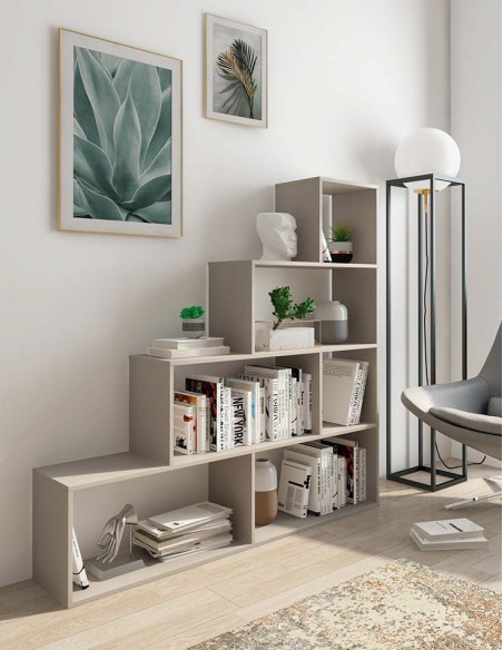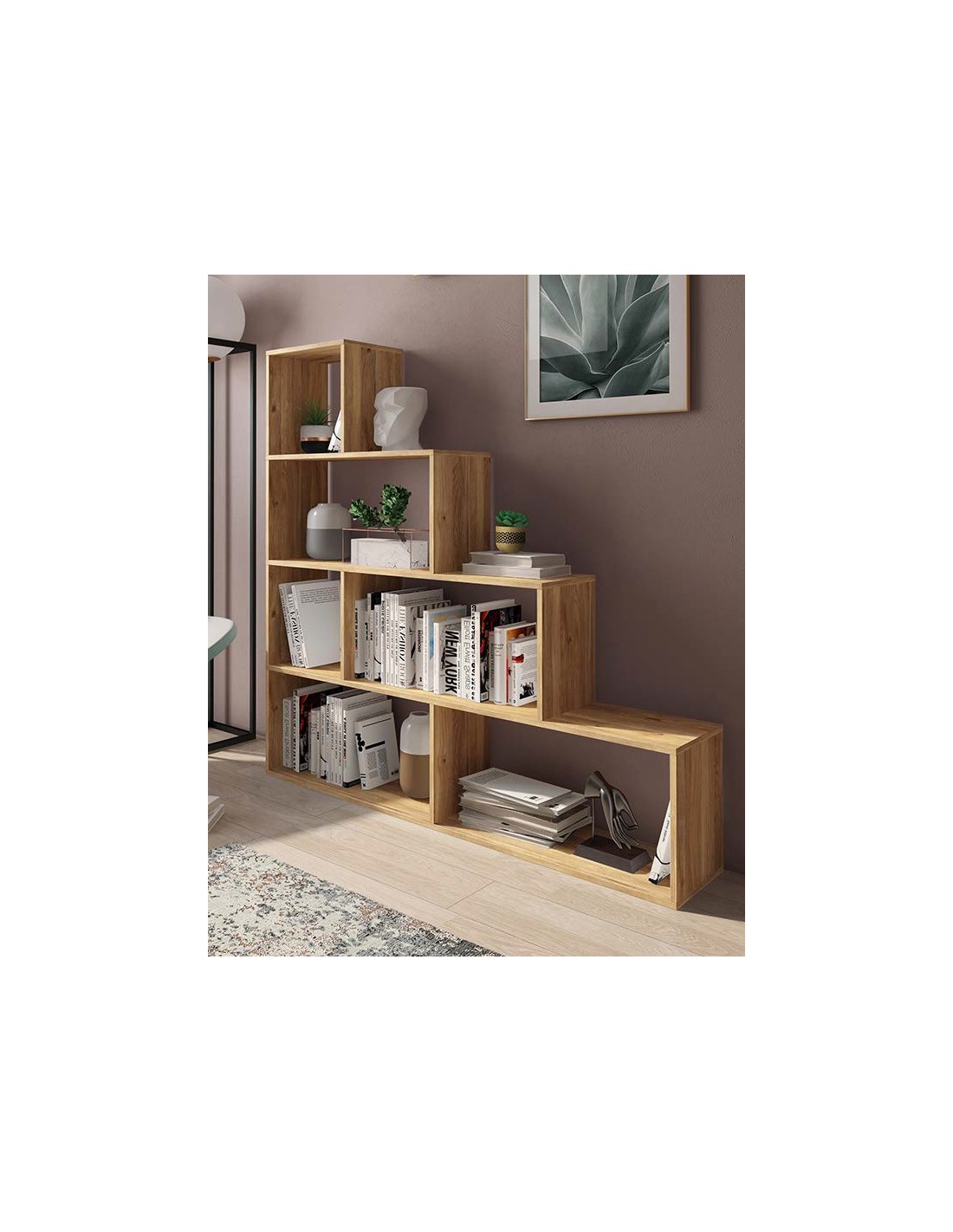 Estantería de diseño moderno, con separadores de estructura y estantes asimétricos. La estantería está fabricada con tablero melamínico y herrajes metálicos.