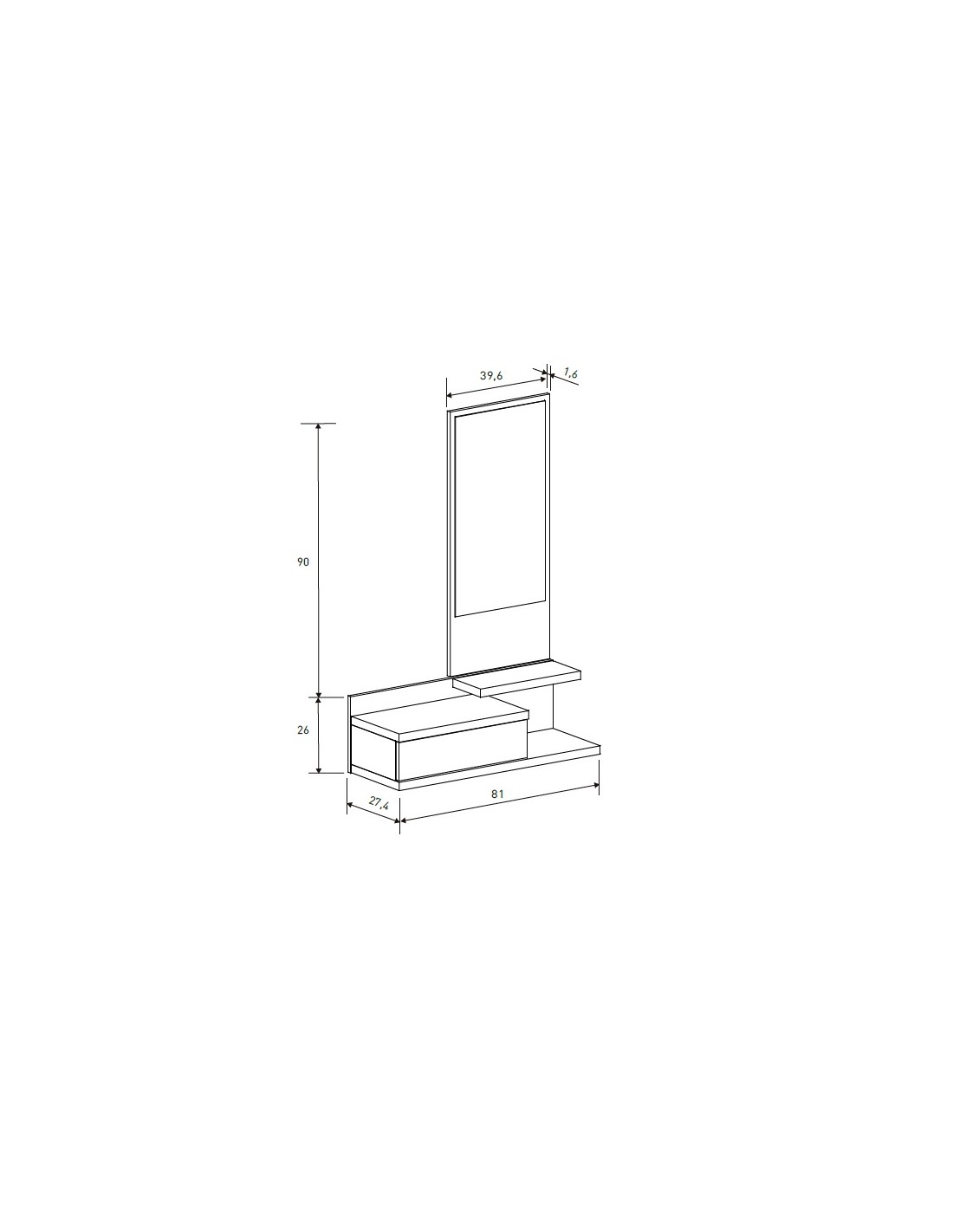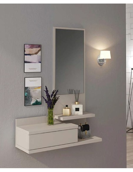 Este recibidor está formado por un espejo vertical, y un mueble que se instala directamente en la pared, donde podrá dejar todos los objetos al entrar en casa y tenerlos siempre a mano. Fabricado en melamina y cristal.