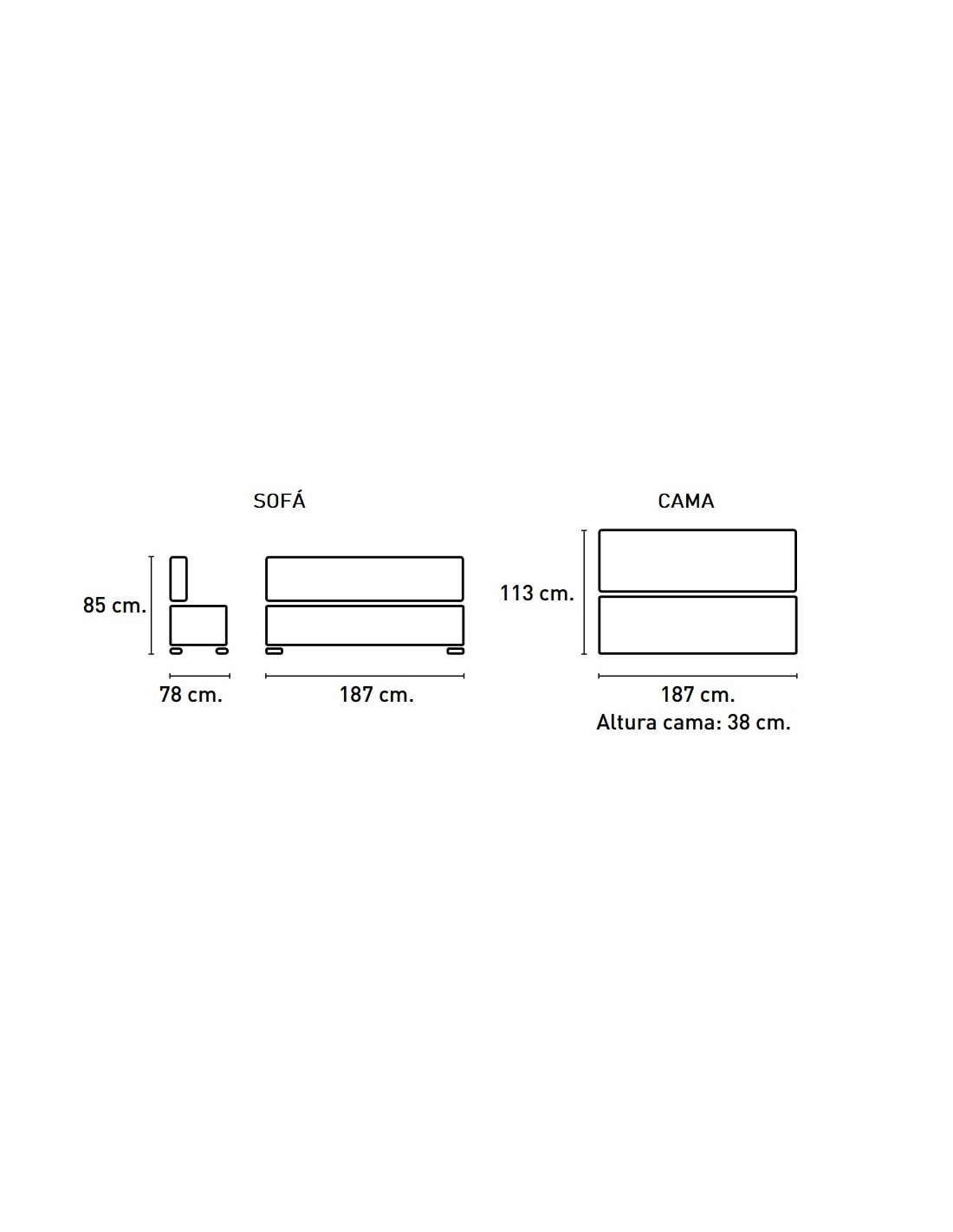 Sofá cama económico, fabricado con armazón de madera y sistema de apertura clic-clac. Relleno de espuma