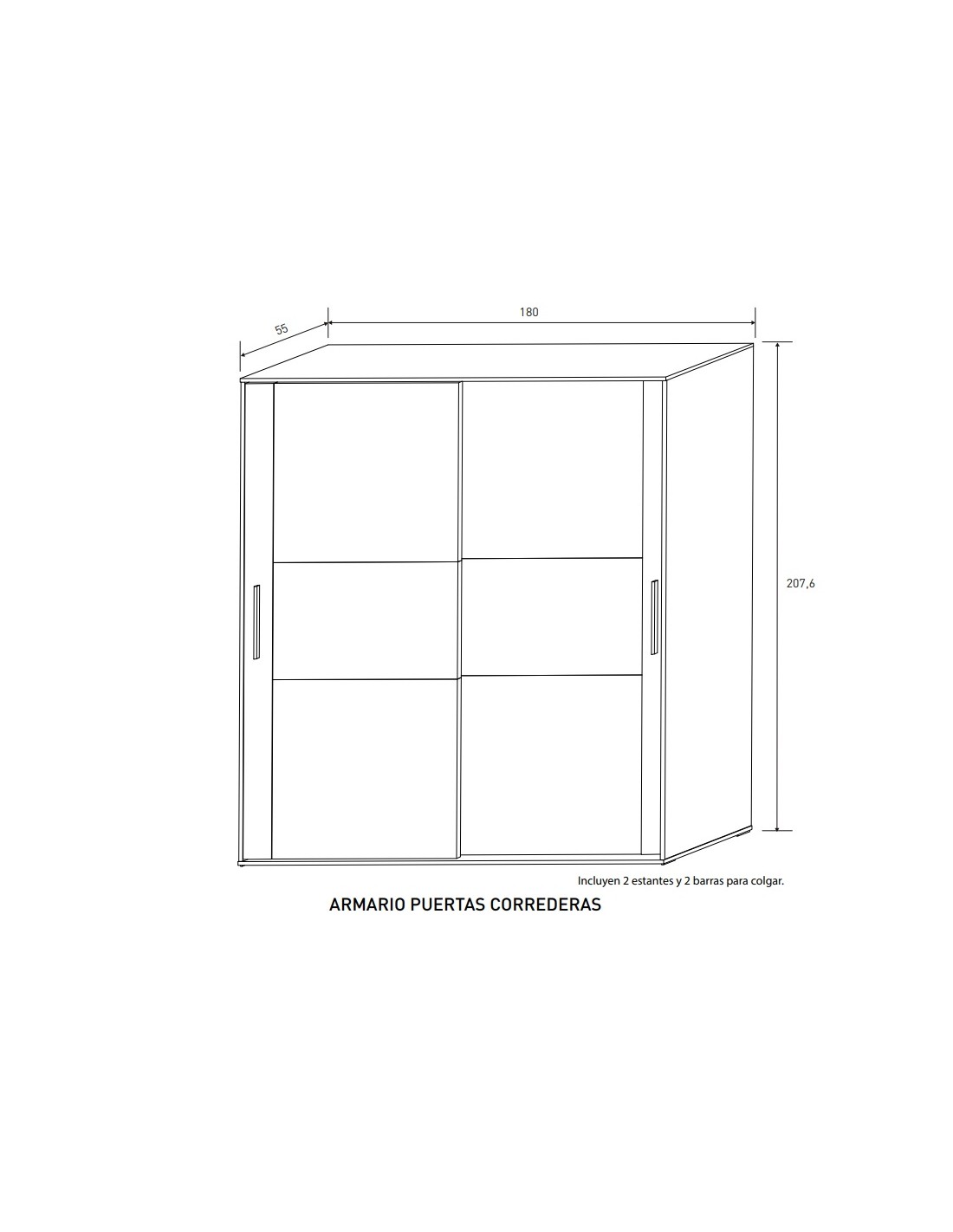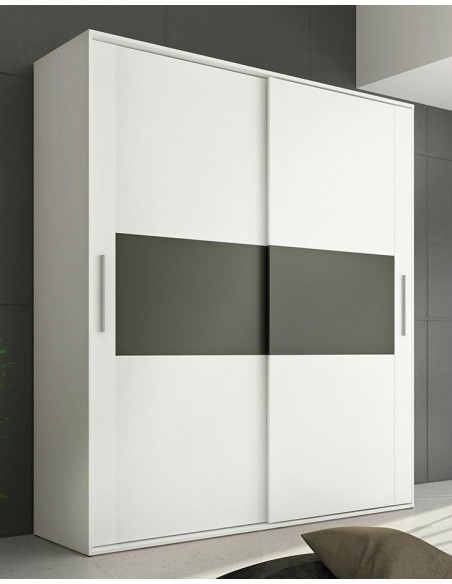 Armario 2 puertas correderas en color blanco con franja frontal en color grafito. Contiene 2 barras para colgar y 2 estantes superiores. Se puede comprar cajonera opcional. Combinable con el dormitorio de la misma serie y con otros disponibles en nuestra página web. MUEBLE EN KIT.