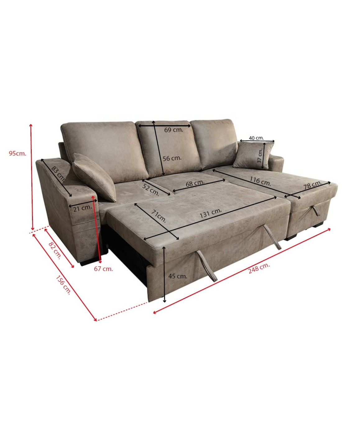 MEDIDAS: Alto 102 cm* Ancho 250cm - Profundidad 90cm - brazo chaiselongue 150 cm.