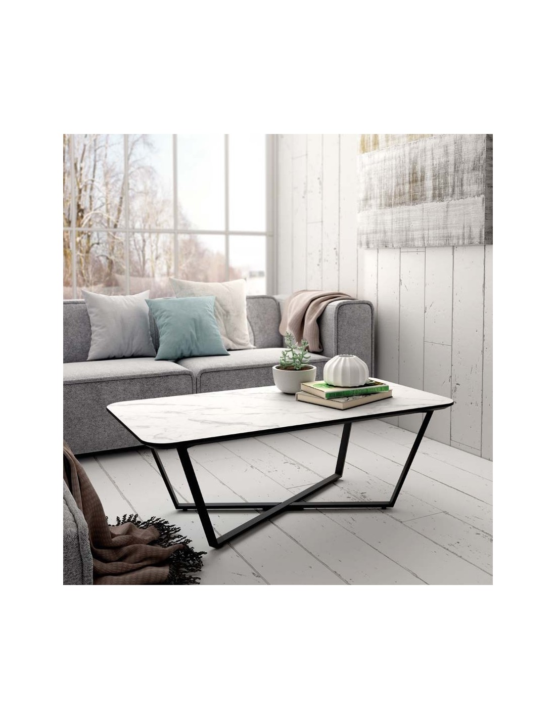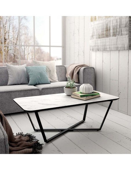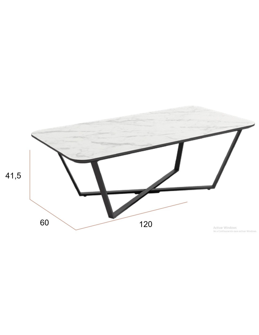 Mesa de centro rectangular. Patas metálicas negras y sobre biselado de 120 x 60 cm y 25 mm de espesor en 3 acabados diseño piedra.