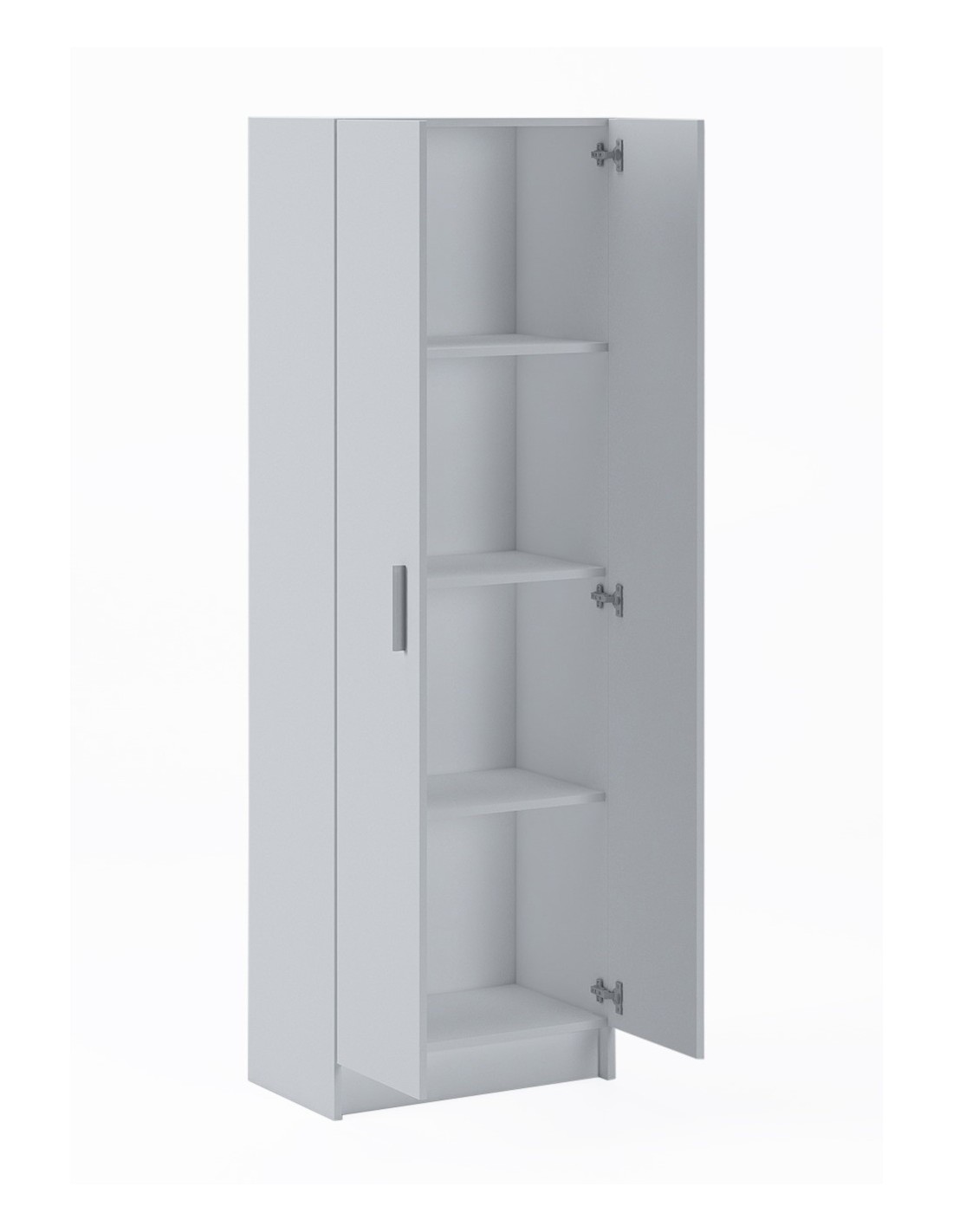 Armario de dos puertas con 3 estantes interiores para poder organizar todo lo que necesite. El armario es de color blanco y los tiradores son de color gris. Fabricado en melamina de alta calidad y con herrajes metálicos. Posibilidad de elegir el armario de dos puertas o de tres puertas. Mueble KIT. No se incluyen los elementos decorativos. Los cuales podrá encontrar en la sección decoración.
