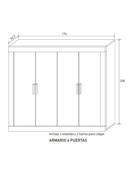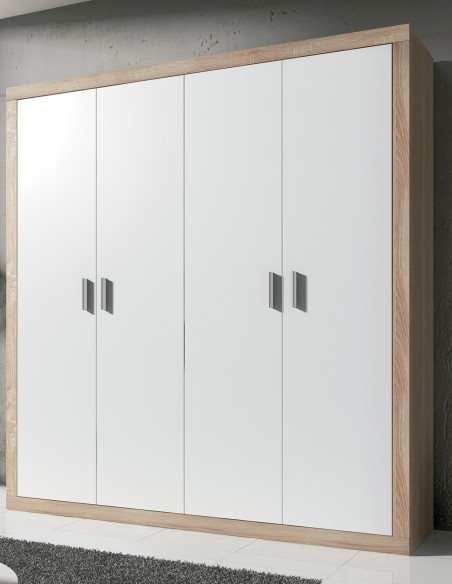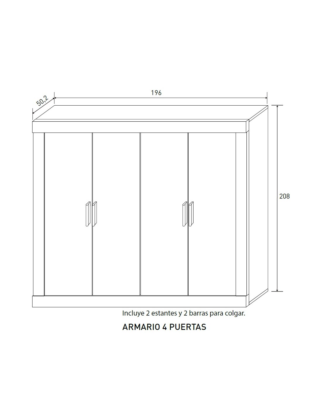 Gran armario de cuatro puertas batientes de 200cm de ancho. fabricado en melamina contrachapada de buena calidad y herrajes metálicos. Lo cual le convierte en un producto muy práctico y duradero. Es perfecto para cualquier dormitorio para aprovechar su amplio almacenaje. Incluye dos barras para colgar y dos estantes interiores. Disponible en cambria-blanco,cambria-grafito, puccini-textil y andersen pino- gris. Se sirve en formato KIT. La cajonera del interior NO ESTÁ INCLUIDA.