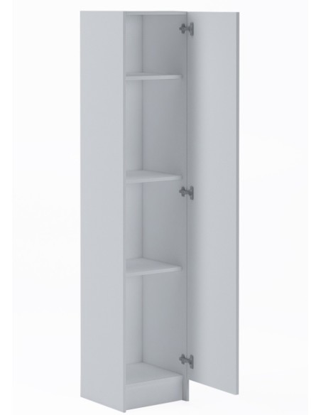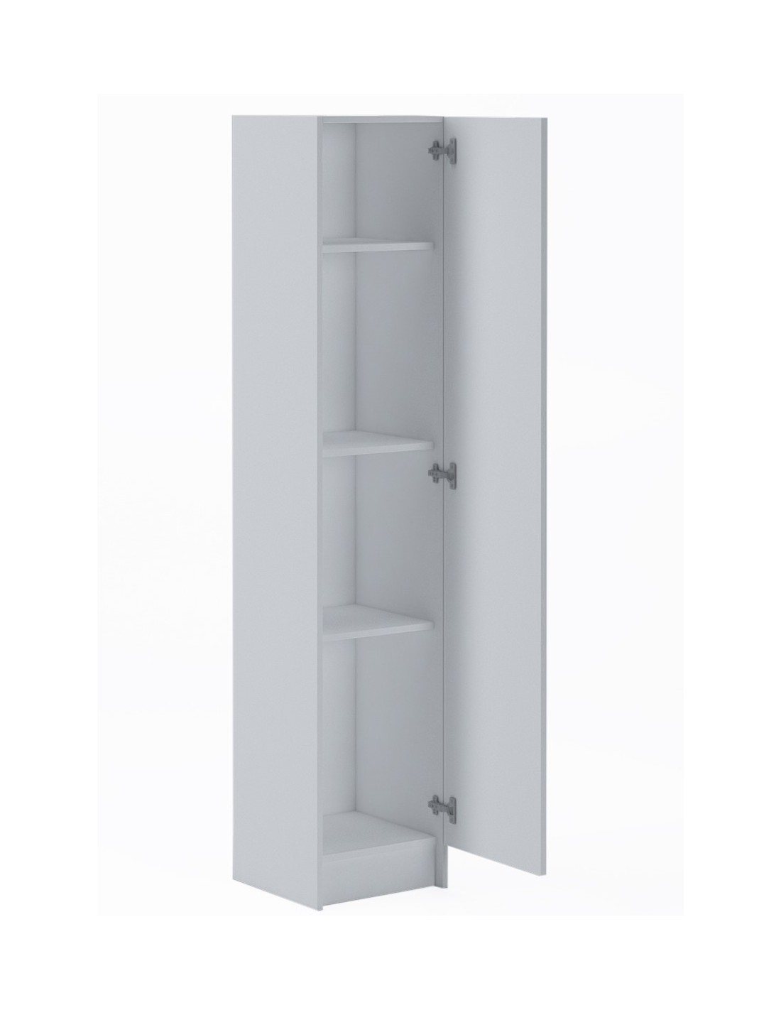 Armario de una puerta con 3 estantes interiores para poder organizar todo lo que necesite. El armario es de color blanco y los tiradores son de color gris. Fabricado en melamina y herrajes metálicos. Mueble KITNo se incluyen los elementos decorativos. Los cuales podrá encontrar en la sección decoración.