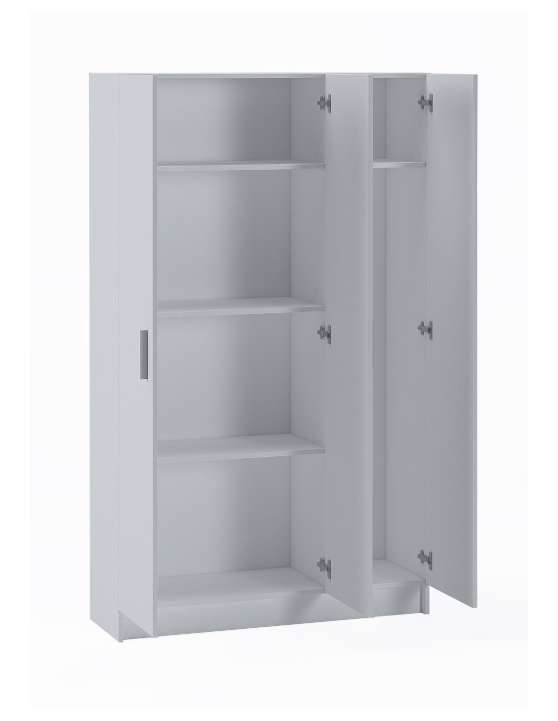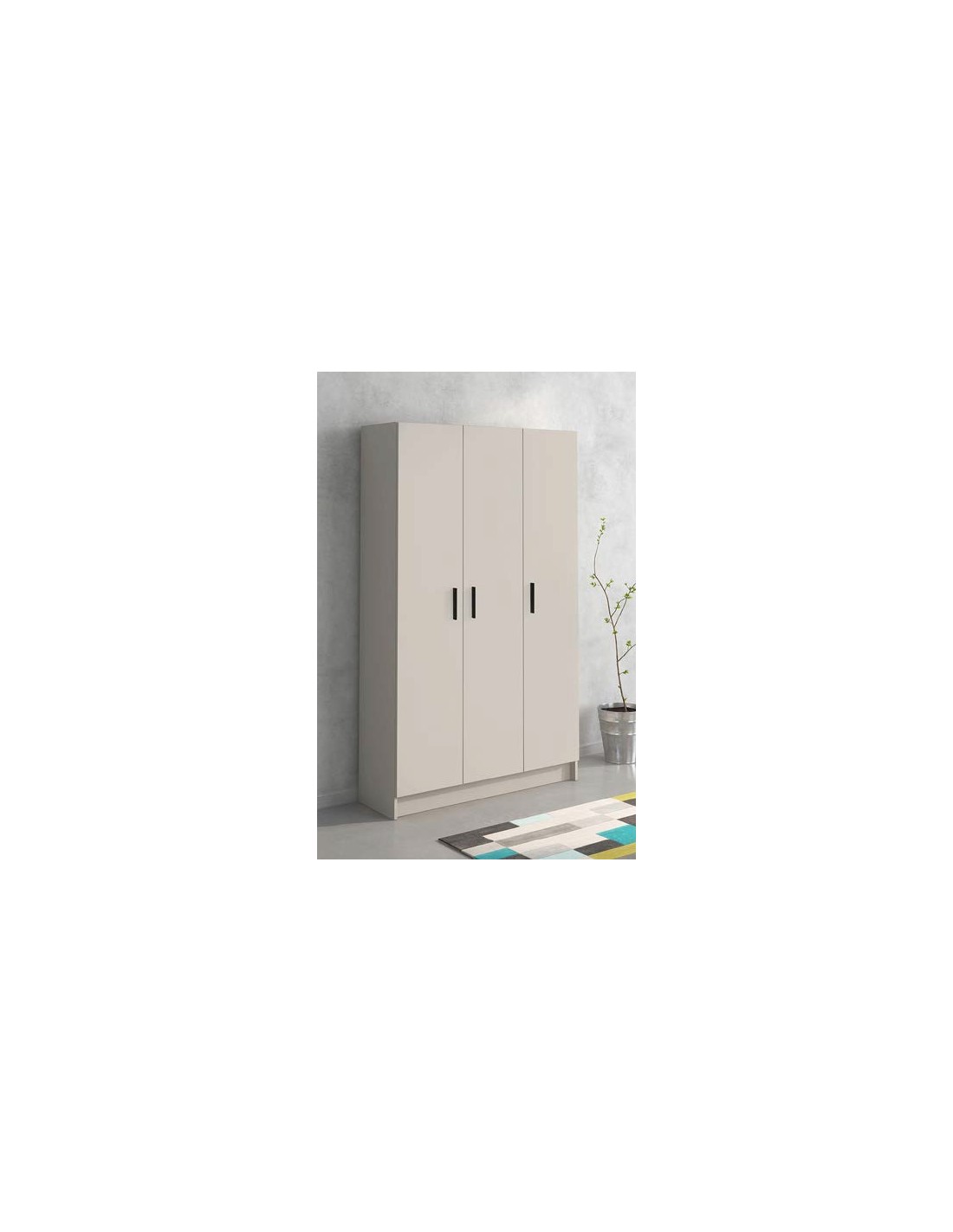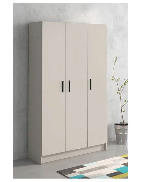 Armario de tres puertas con 3 estantes interiores para poder organizar todo lo que necesite. El armario es de color blanco y los tiradores son de color gris. Fabricado en melamina de alta calidad y con herrajes metálicos. Posibilidad de elegir el armario de dos puertas o de tres puertas. Mueble KIT. No se incluyen los elementos decorativos. Los cuales podrá encontrar en la sección decoración