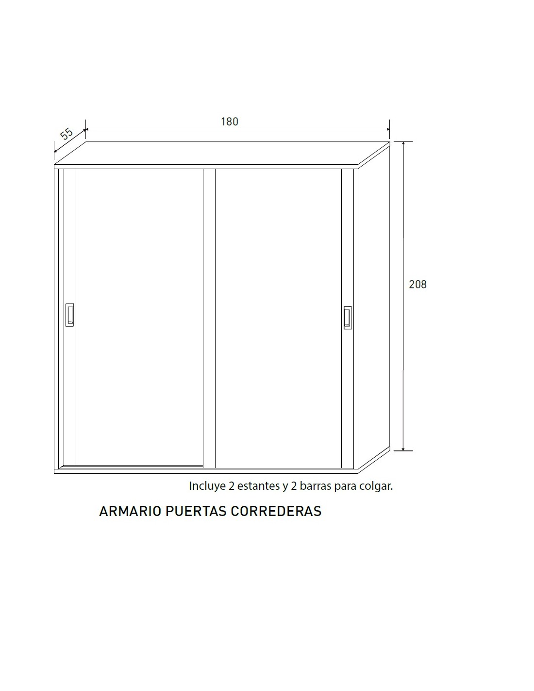 Gran armario de puertas correderas de180cm. fabricado en melamina contrachapada de buena calidad y herrajes metálicos. Lo cual le convierte en un producto muy práctico y duradero. Es perfecto para cualquier dormitorio para aprovechar su amplio almacenaje. Incluye dos barras y dos estantes interiores. Disponible en cambria-blanco, cambria-grafito, blanco y andersen pino- gris. Se sirve en formato KIT. La cajonera del interior NO ESTÁ INCLUIDA.