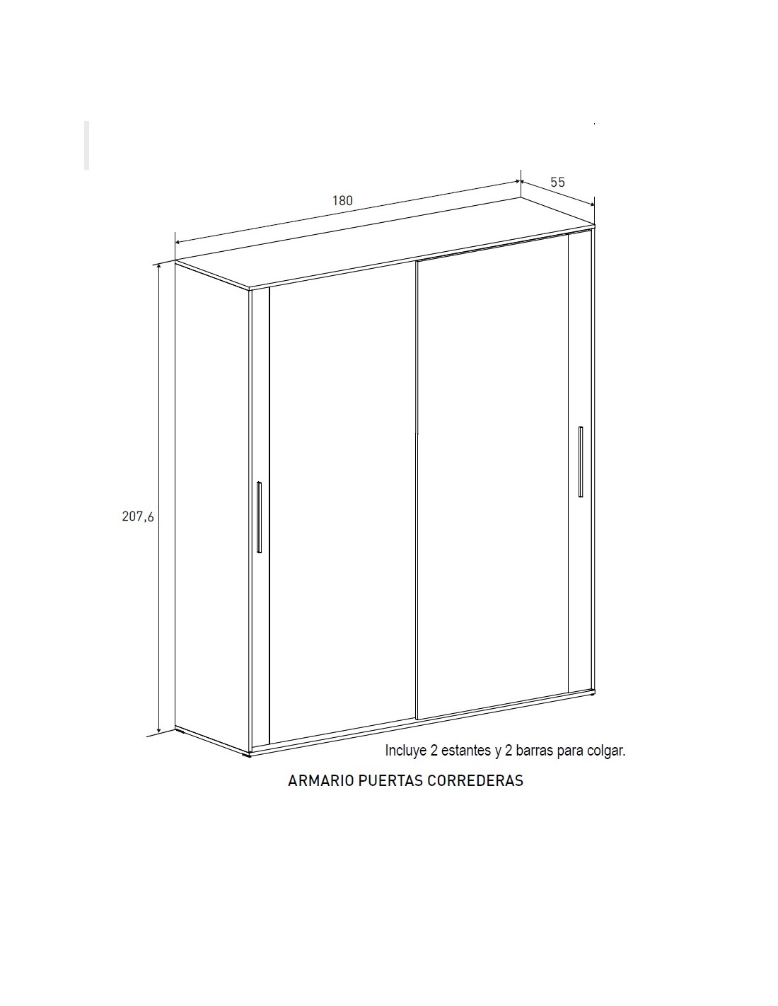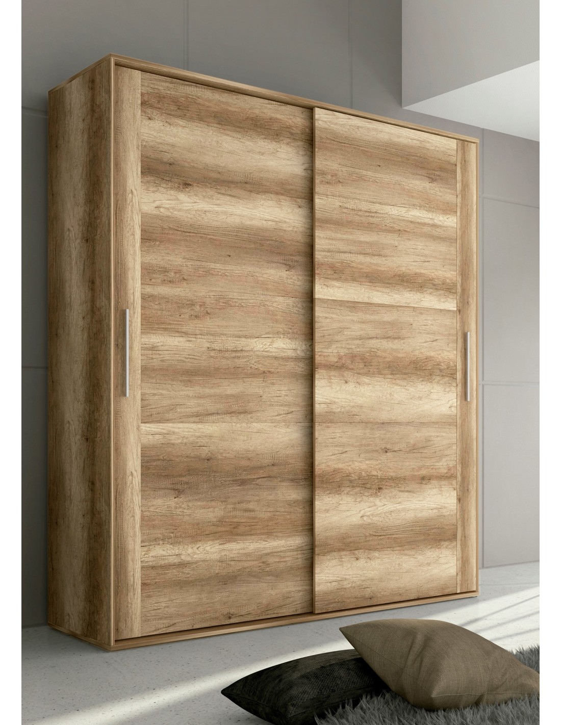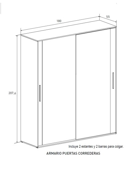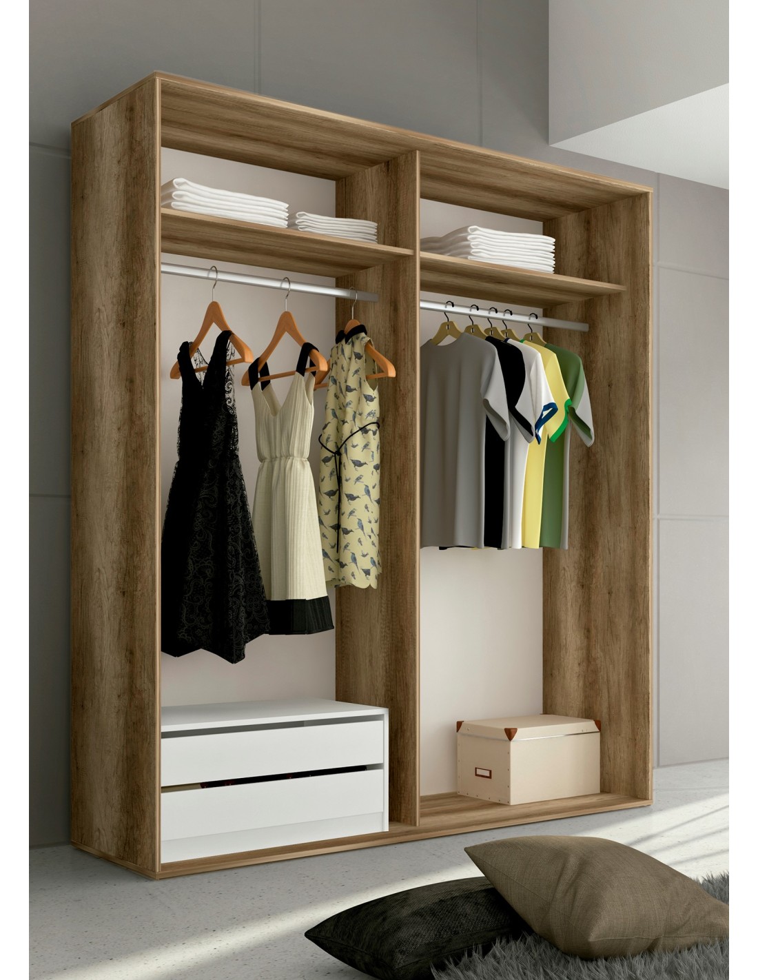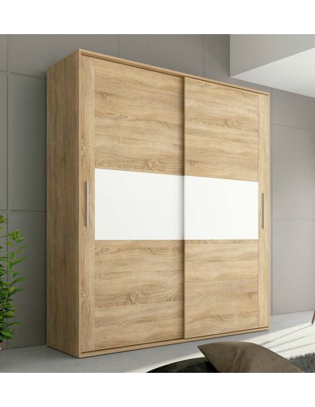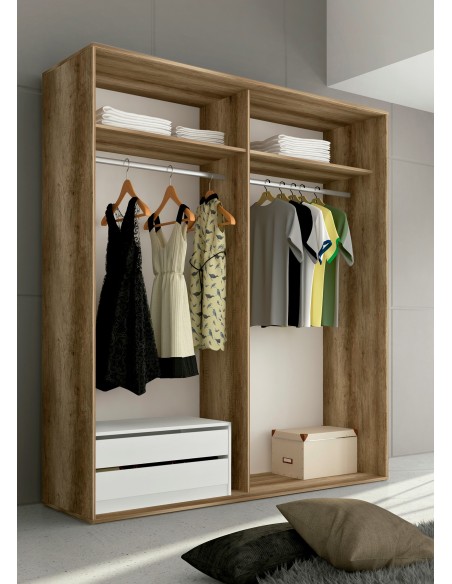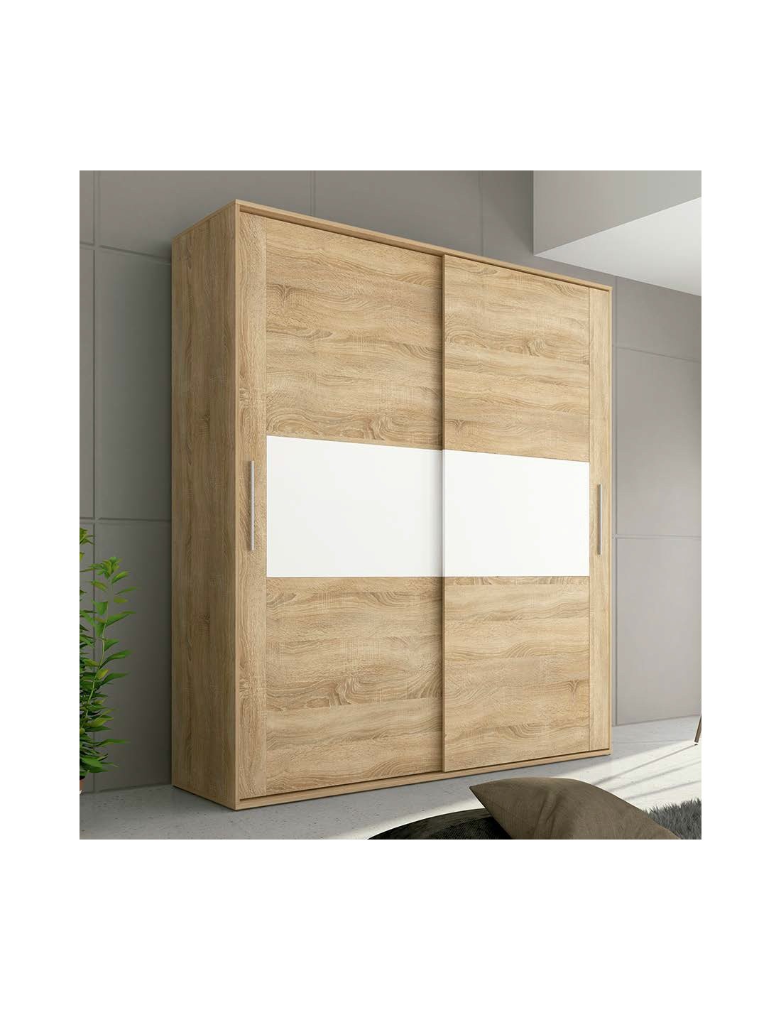Armario de dos puertas correderas de gran tamaño en color Cañón o cambrian-blanco. Ideal para cualquier dormitorio de matrimonio. Incluye dos barras para colgar y dos estantes interiores. La cajonera interiores es opcional. Mueble KIT,