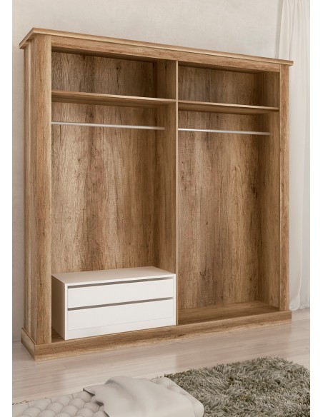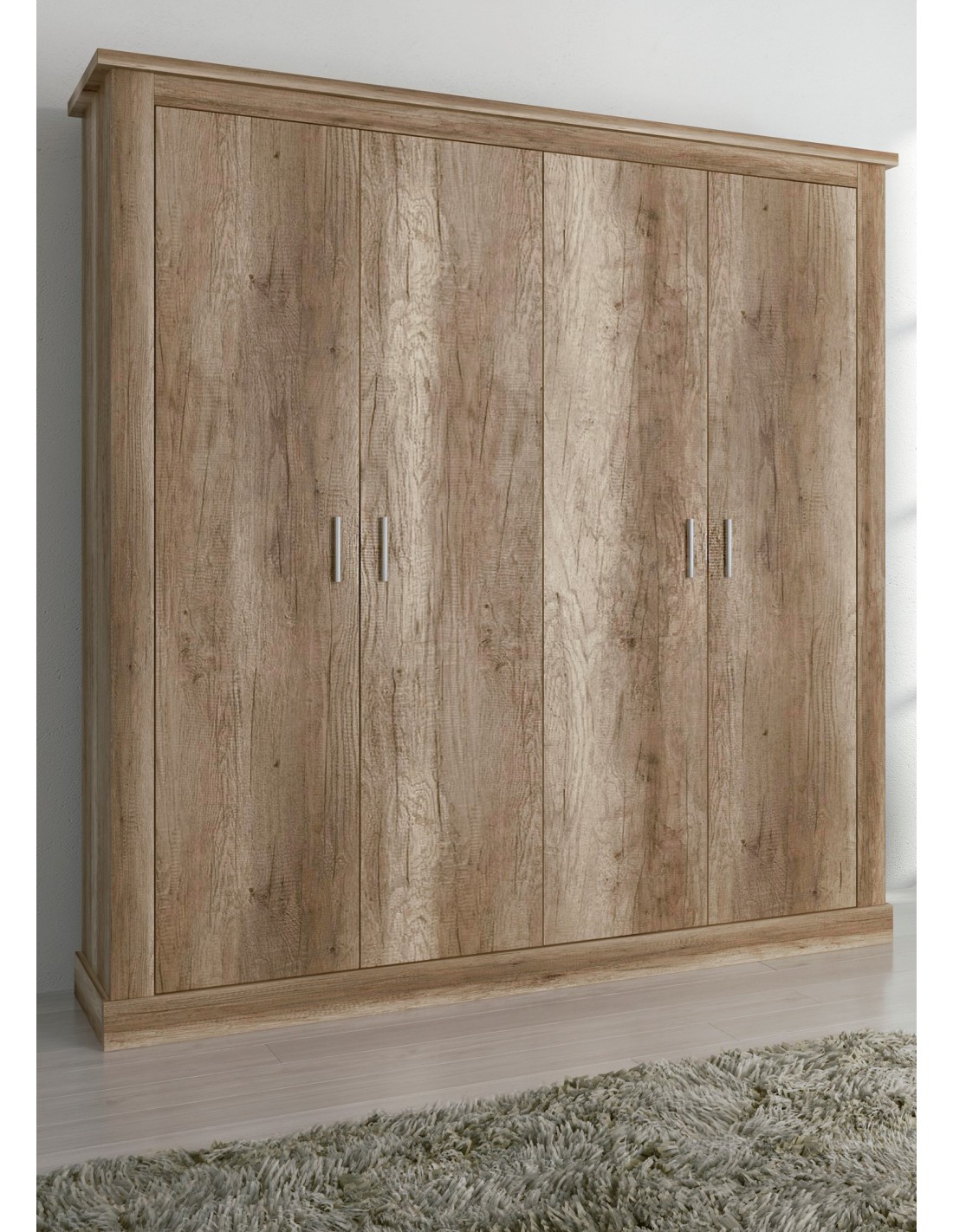Gran armario de cuatro puertas, ideal para ambientes de matrimonio. Disponible en color Cañón, tono rústico. Fabricado en tablero de aglomerado con chapa sintetica y melaminizada (16 y 32mm), con herrajes metálicos. Se sirve en KITLa cajonera del interior NO ESTÁ INCLUIDA.