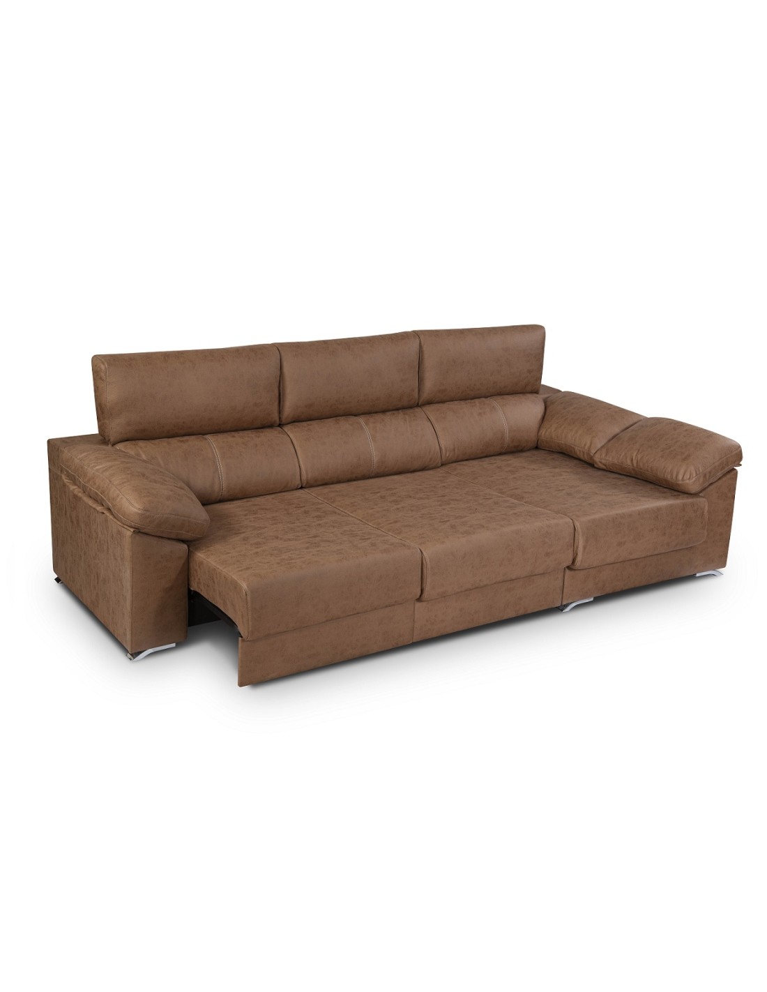 Chaiselongue de asiento extra extensible de carro. Esta fabricado con estructura de madera de pino y aglomerado de primera calidad. Los asientos son de espuma de poliuretano de 30kg de densidad y las almohadas de fibra hueca. Los respaldos, brazos y cojines son desenfundables y lavables. Las patas son cromadas. Oferta disponible en medida de 240 cm y 280 cm.Los respaldos son reclinables mediante bisagras metálicas, y los asientos se pueden extender mediante mecanismo de carro con ruedas. Los brazos están acolchados, lo que le proporciona un extra de comodidad. Está disponible en gran variedad de telas y colores, que deberá elegir en el despegable. Posibilidad de poner arcón abatible. En el momento de seleccionar la posición del brazo del chaiselongue, será mirando de frente al chaiselongue “hacia la derecha o hacia la izquierda”. Es posible realizar variaciones de la medida según sus necesidades, siempre puede contactar con nosotros y le informaremos de todas las posibilidades disponibles.