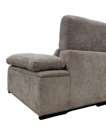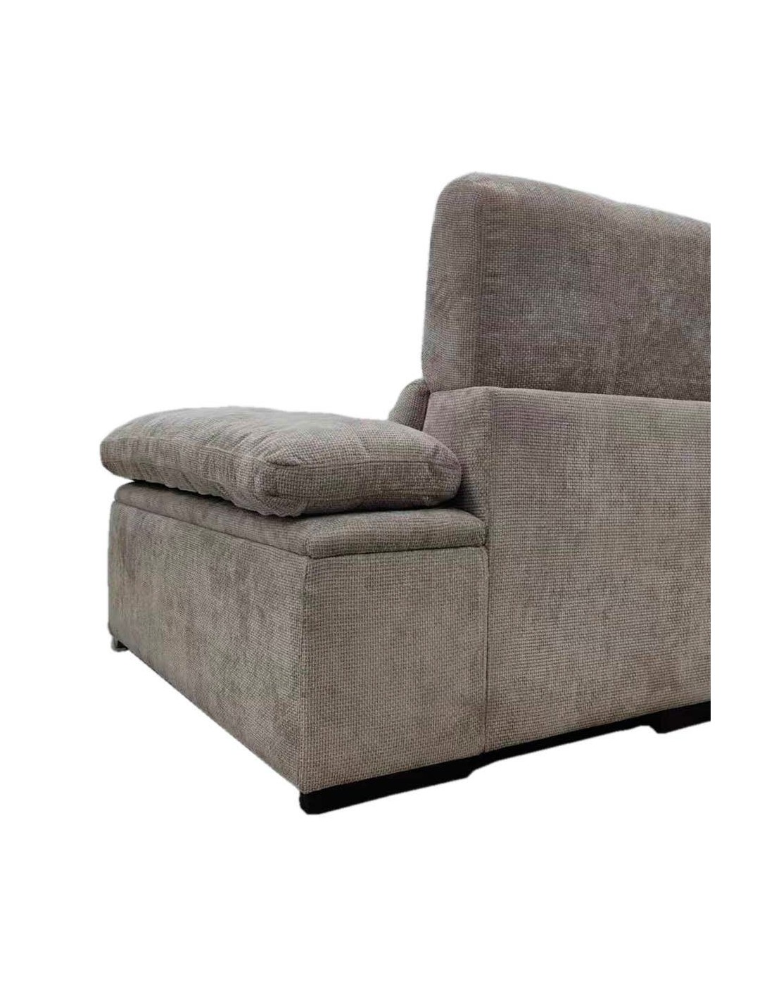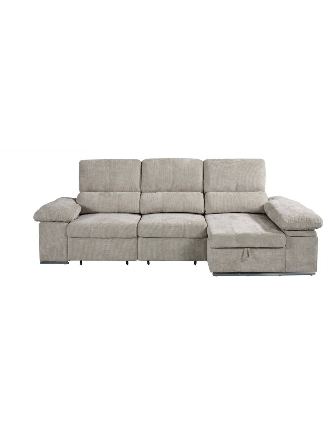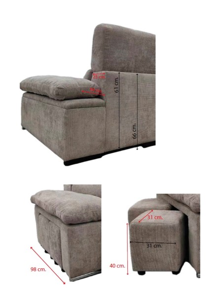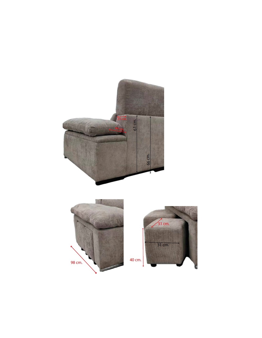 Chaiselongue cama con arcones y 2 taburetes en el brazo. Convertible en cama. Dos arcones: asiento y brazo del módulo. Incluye 2 taburetes tapizados en el brazo corto. Estructura de madera. Asientos de muelle y espuma. Mecanismo metálico. Asientos extraíbles de carro con apoyo al suelo.