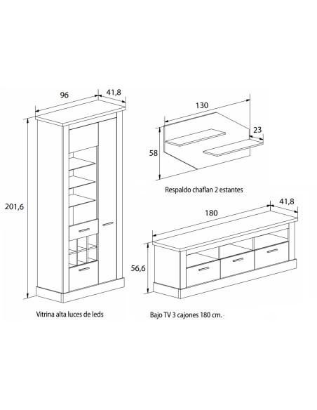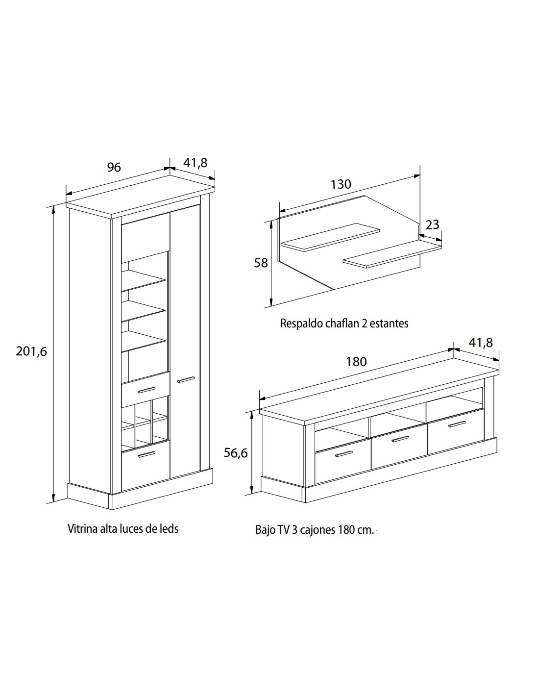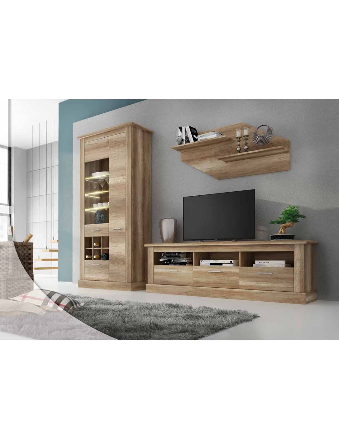Composición de salón de 276 cm de acabado rústico, pero con un diseño moderno. Compuesto por: bajo de tv con tres cajones y tres huecos, gran vitrina compuesta por varias puertas que combinan el cristal y la madera, con botellero, y dos estantes de pared con trasera. Fabricado en tablero melamínico de alta calidad con chapa sintética y melaminizada (16 y 32mm), Herrajes metálicos y cristal de 4mm.
