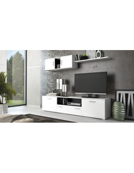 Composición Ximas moderna de 200 cm, compuesto por bajo tv, alto para colgar y estante. Salón ideal para apartamentos pequeños. Disponible en dos acabados: BLANCO-GRAFITO, CAMBRIAN-BLANCO.