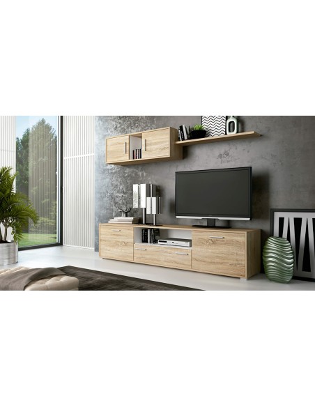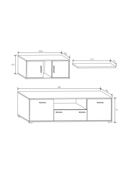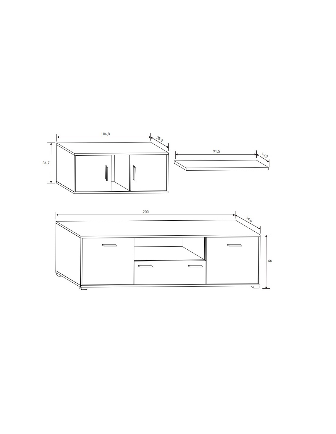 La composición Ximas tiene una medida de 200 cm, está compuesto por bajo de tv con dos puertas, cajón y hueco, alto para colgar con puertas, y un estante. Fabricado en tablero melamínico de alta calidad, a elegir en dos acabados. Los herrajes son metálicos y las patas de plástico.