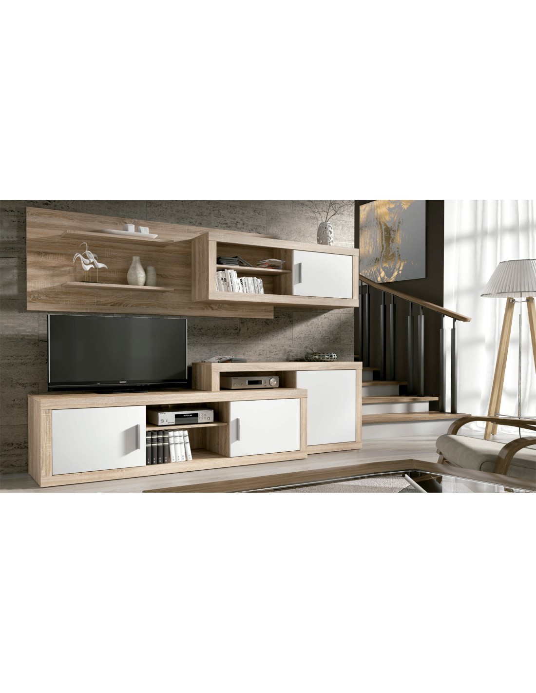 Composición Ópalo de 241cm. Composición de salón completa compuesta por módulos bajos y altos, combinados en tres acabados. MUEBLE KIT.