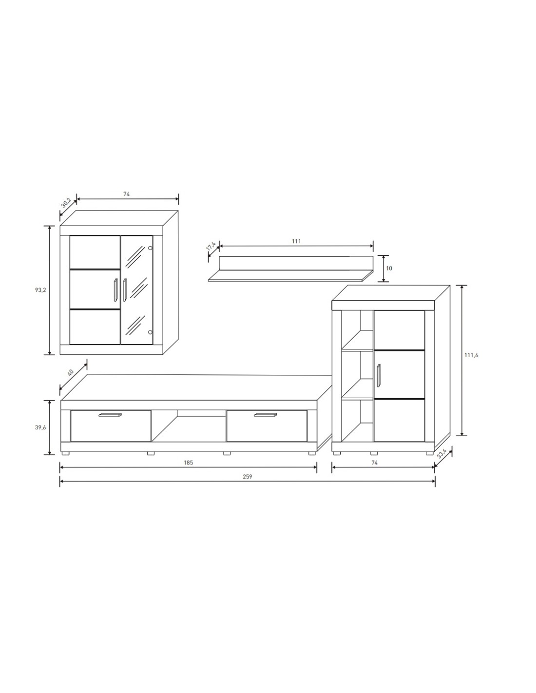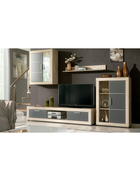 Composición de salón ideal para ambientes de salón modernos, con gran cantidad de almacenaje. Dispone de un bajo con dos puertas y huecos, un bodeguero con puerta y hueco con estantes, una vitrina colgada que combina puerta opaca y cristal con luces leds en el interior, y un estante de pared. Fabricado en tablero melamínico de alta calidad, a elegir en tres acabados. Los herrajes son metálicos.