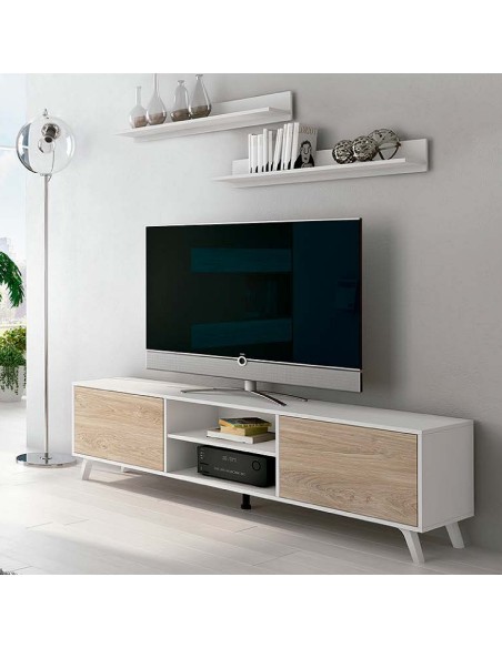La composición sota tiene una medida de 180 cm, está compuesto por bajo de tv con puertas de apertura push y dos estantes con trasera para colgar. Fabricado en tablero melamínico de alta calidad, a elegir en tres acabados. Los herrajes son metálicos y las patas de plástico.