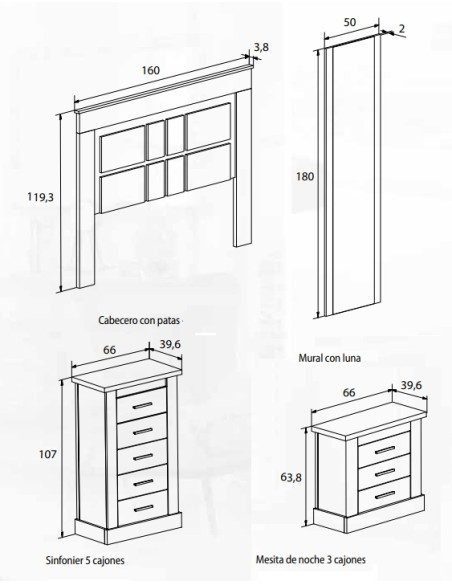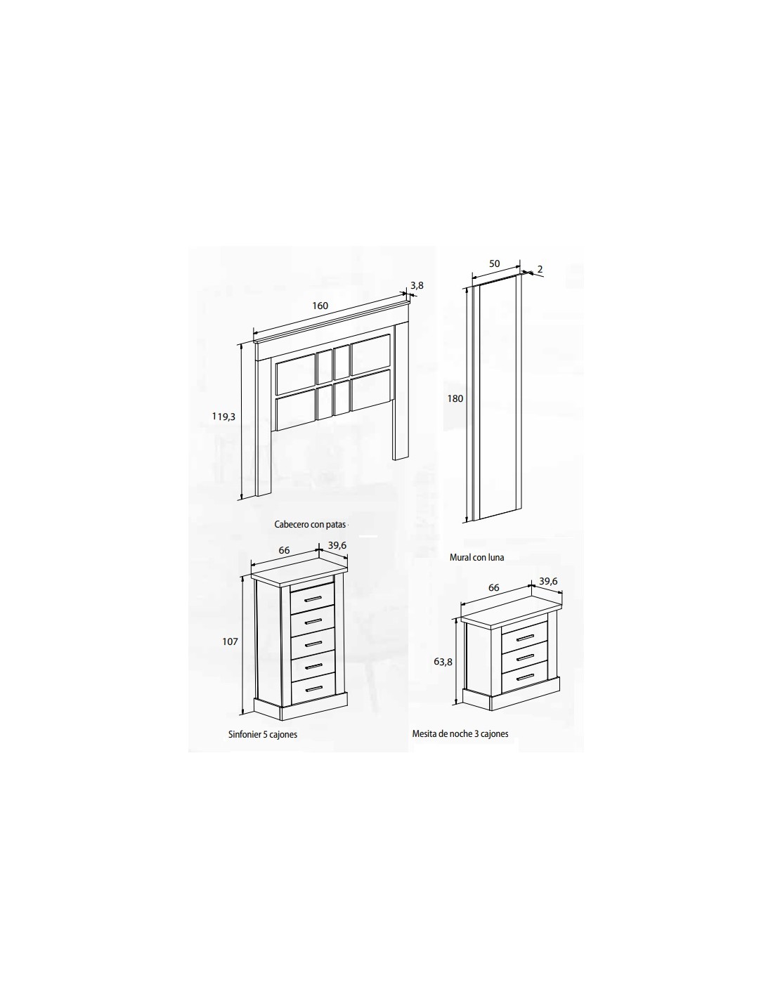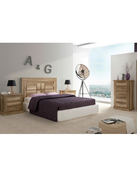 Dormitorio de matrimonio compuesto por, cabecero con patas y plafón de madera con piezas en relieve, dos mesitas con tres cajones cada una. El sinfonier de cinco cajones y mural con luna son opcionales, según las necesidades del cliente, puede cogerse o no. Está fabricado con tablero de aglomerado con chapa sintetica y melaminizada (16 y 32mm), y herrajes metálicos. No se incluye colchón ni somier ni decoración, los cuales están disponibles en la sección descanso y decoración.