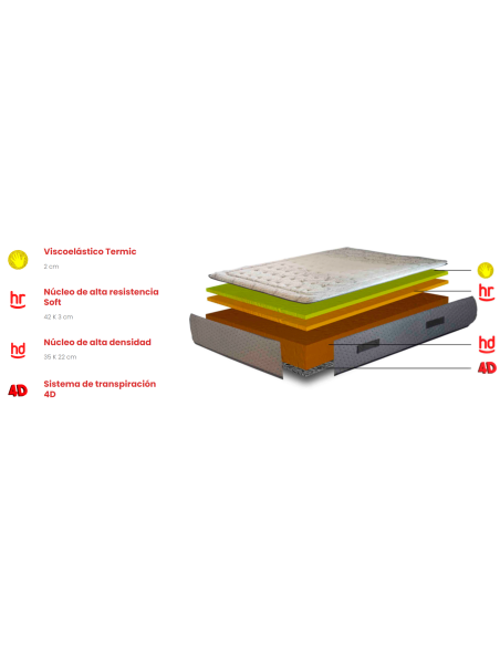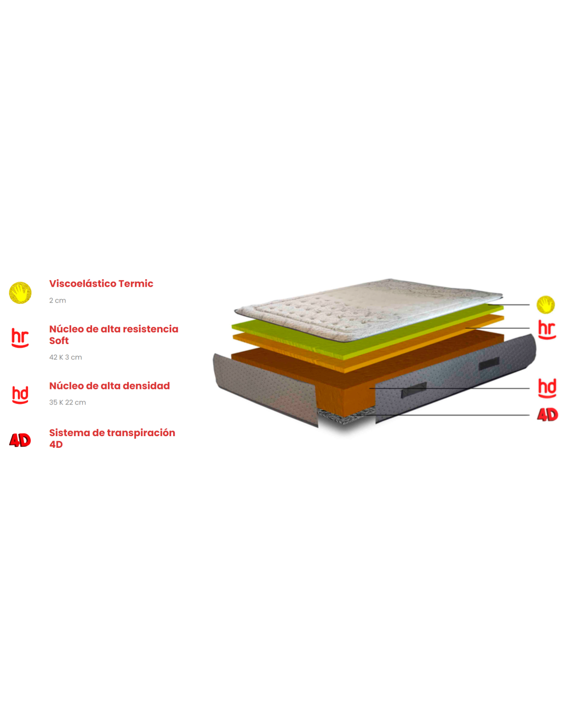 Colchón de alta firmeza y resistencia, de materiales de primera calidad. El núcleo de alta densidad 35k proporciona una alta durabilidad. El viscoelástico termic suaviza el contacto con el cuerpo y aporta un extra de frescor gracias a sus características atérmicas. Variedad de medidas.