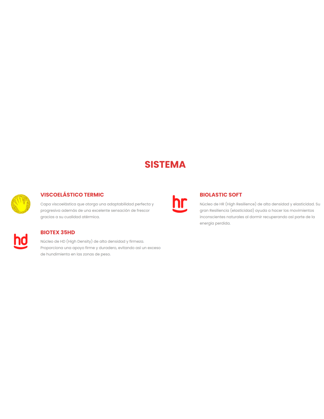 Núcleo de HR (High Resilience) de alta densidad y elasticidad. Su gran Resiliencia (elasticidad) ayuda a hacer los movimientos inconscientes naturales al dormir recuperando así parte de la energía perdida.