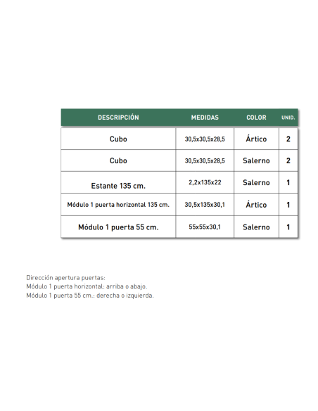 La composición Hermes está formada por módulos en color ÁRTICO y SALERO. Compuesta por 1 módulo bajo de 1 puerta horizontal y un módulo de 1 puerta, cuatro cubos y un estante. Tiene una buena relación calidad precio. Fabricado en tablero melamínico de 16 mm, con canto de 0,8 mm con aplicativo color PUR NATURE termofusible de poliuretano BIO-BASED (s/normativa ASTM 6866-16, análisis Carbono 14). Son sinónimo de calidad, tecnología y bienestar, con sellado PUR y tratamiento antihumedad para favorecer su resistencia. La última tecnología mecánica aplicada a la decoración del hogar.