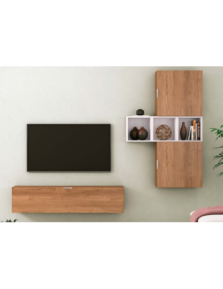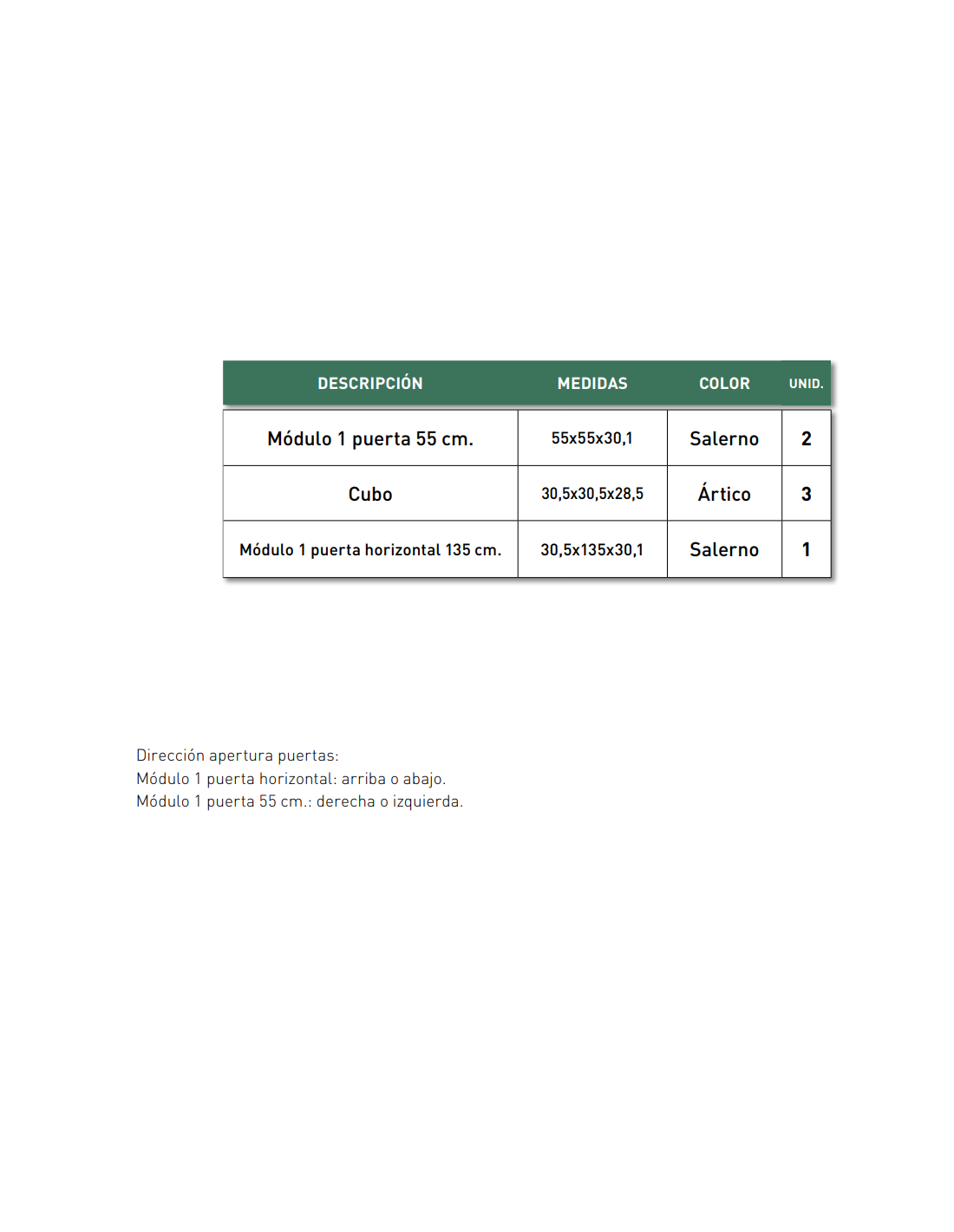 La composición Italia está formada por módulos en color ÁRTICO y SALERO. Compuesta por 1 módulo bajo de 1 puerta horizontal de 135cm, dos módulos de 1 puerta y tres cubos. Tiene una buena relación calidad precio. Fabricado en tablero melamínico de 16 mm, con canto de 0,8 mm con aplicativo color PUR NATURE termofusible de poliuretano BIO-BASED (s/normativa ASTM 6866-16, análisis Carbono 14). Son sinónimo de calidad, tecnología y bienestar, con sellado PUR y tratamiento antihumedad para favorecer su resistencia. La última tecnología mecánica aplicada a la decoración del hogar.