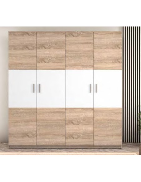 Este armario tiene 4 puertas batientes, está fabricado en melamina contrachapada de buena calidad y herrajes metálicos. Lo cual le convierte en un producto muy práctico y duradero.