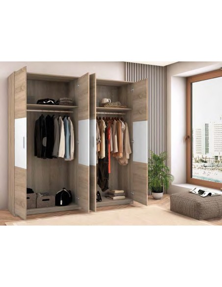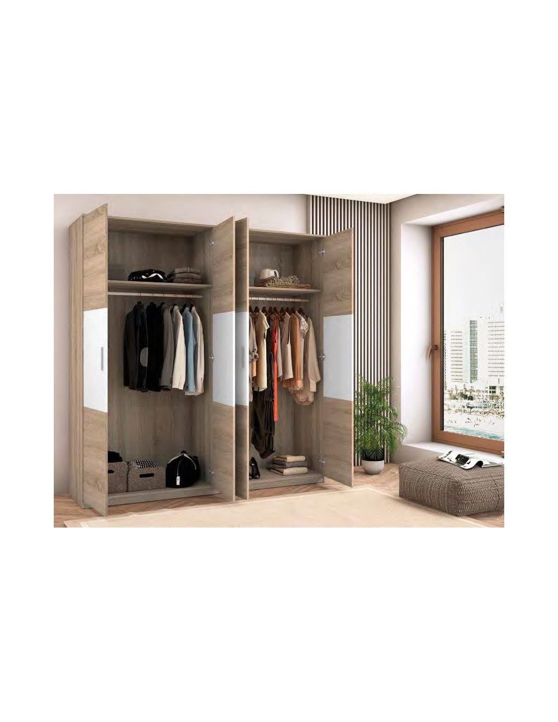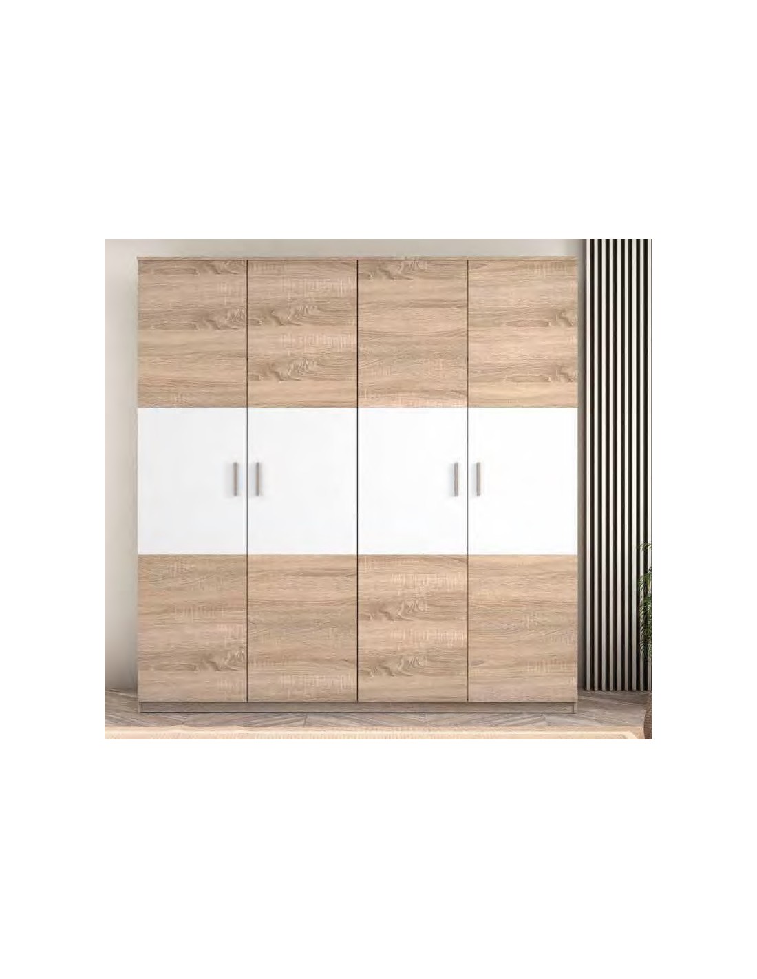 El armario Mika tiene 4 puertas batientes, de 200cm de ancho, es un modelo económico y amplio. Tiene gran capacidad. Incluye dos barras para colgar y dos estantes interiores. Disponible en color CAMBRIAN-BLANCO. Armario en formato KIT.