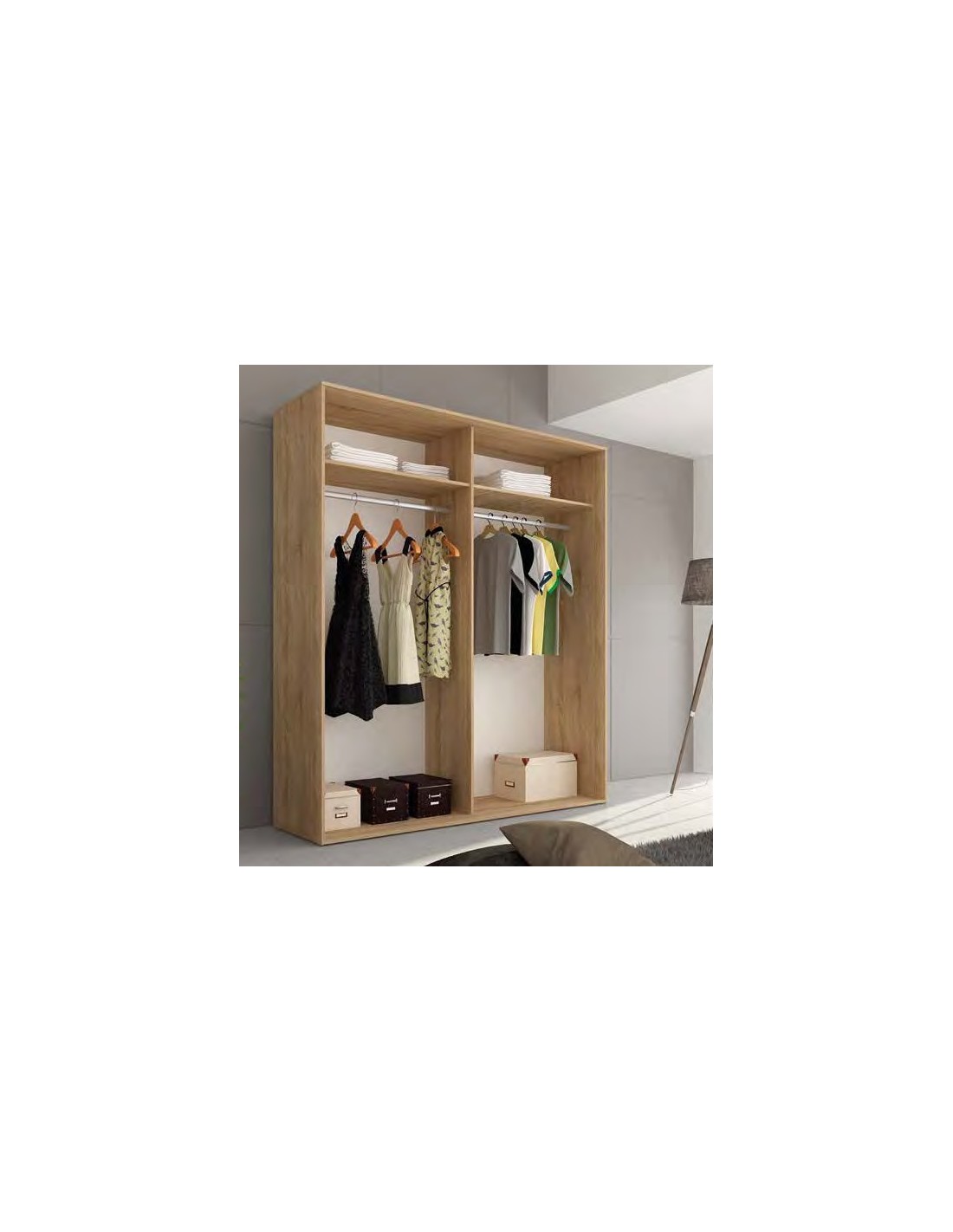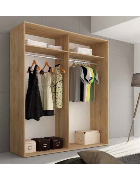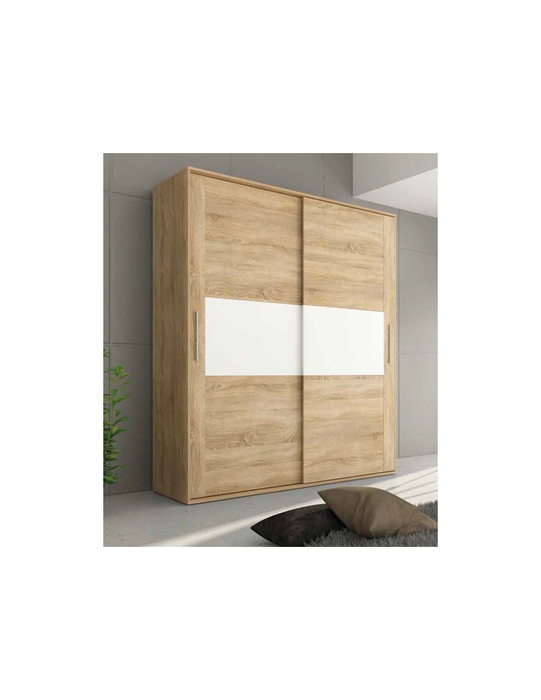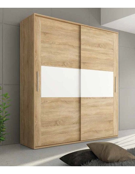 Armario de dos puertas correderas, son un tamaño ideal para dormitorios de matrimonio. Fabricado con tablero de aglomerado con chapa sintética y melaminizada (16 y 32mm), con herrajes metálicos. Disponible en color CAMBRIAN-BLANCO. Ideal para combinar con las mesitas y resto de mobiliario de series en CAMBRIAN-BLANCO. Mueble en formato KIT. La cajonera del interior NO ESTÁ INCLUIDA.