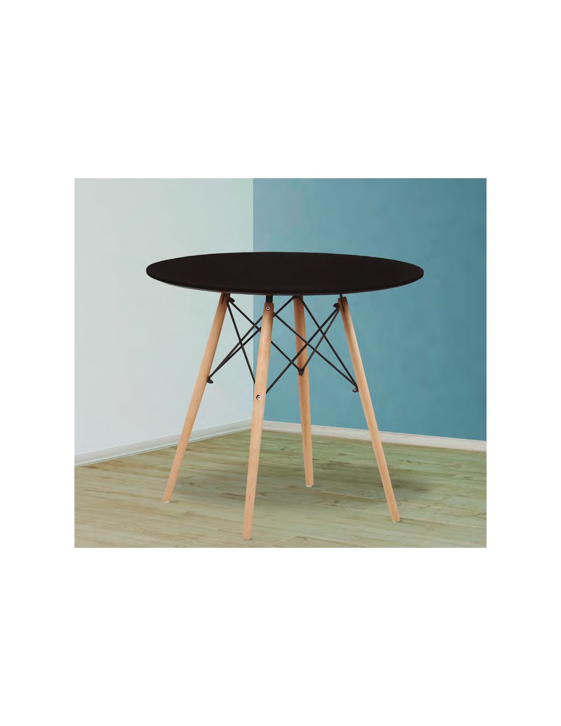 Estupenda mesa redonda con tapa fabricada en DM de alta calidad, patas de madera y herrajes metálicos. Excelente resistencia gracias a sus materiales, ideal para salones o cualquier otro ambiente.
