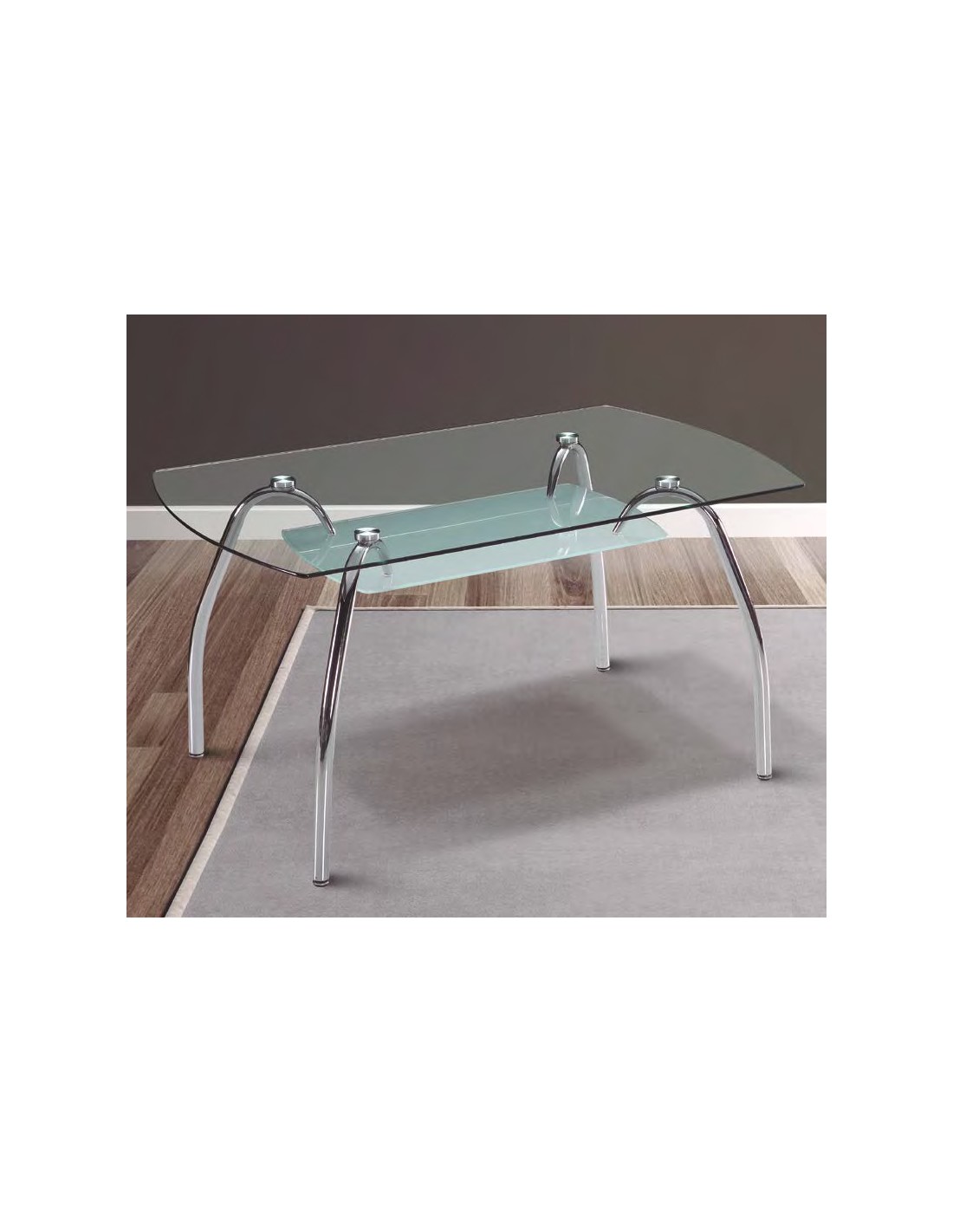La mesa modelo San de cristal templado destaca por su diseño moderno y su inmejorable precio. Dispone de revistero que queda suspendido de sus patas.