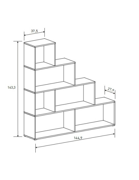 Estantería de diseño moderno, con separadores de estructura y estantes asimétricos. La estantería está fabricada con tablero melamínico y herrajes metálicos.