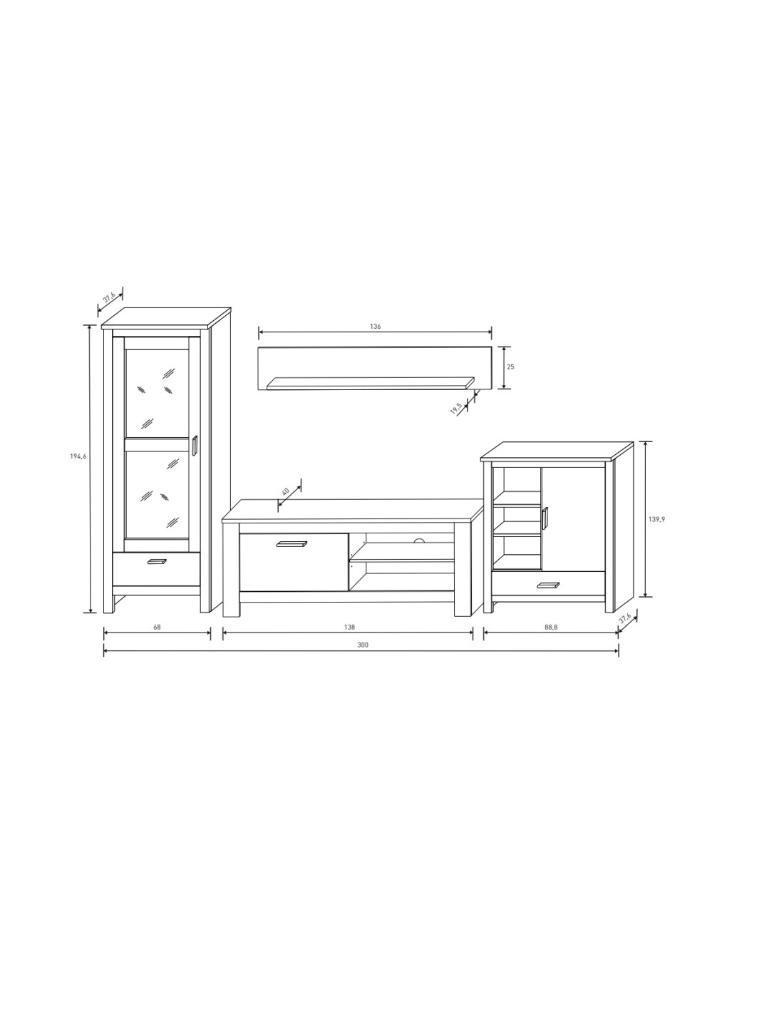 La composición FRIDA de 300cm, está formada por bajo de TV con puerta y dos huecos, un mueble bodeguero con puerta, cajon y huecos, vitrina alta con puertas combinadas en melamina y cristal con un cajón, y un estante con trasera. Tiene una buena relación calidad precio. Fabricado en tablero melamínico de alta calidad, con Herrajes metálicos.