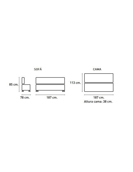 MEDIDAS: Alto 85 cm *Ancho 187 cm * Profundidad 78 cm / 113 cm * Altura al suelo del asiento 38cm.