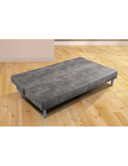 Sofá cama clic-clac con patas cromadas. Tejido microfibra antimanchas a elegir en color cemento y piedra. Gracias a su reducido tamaño es ideal para apartamentos pequeños o habitaciones para disponer de un sofá y tener siempre disponible una cama extra.