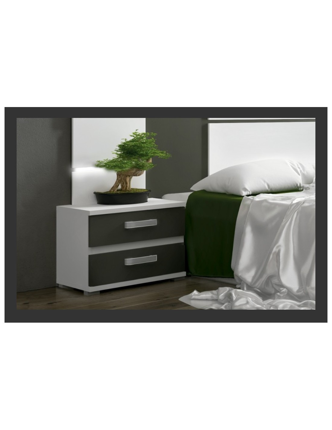 Mesita noche de 2 cajones Cabra, en color blanco con frentes en grafito. Tirador curvo en plateado. MUEBLE FORMATO KIT.