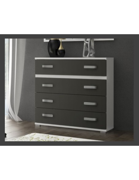 Cómoda de 4 cajones modelo Cabra. Disponible en color blanco-grafito y combinable con el resto de productos de la serie Cabra. Mueble KIT.