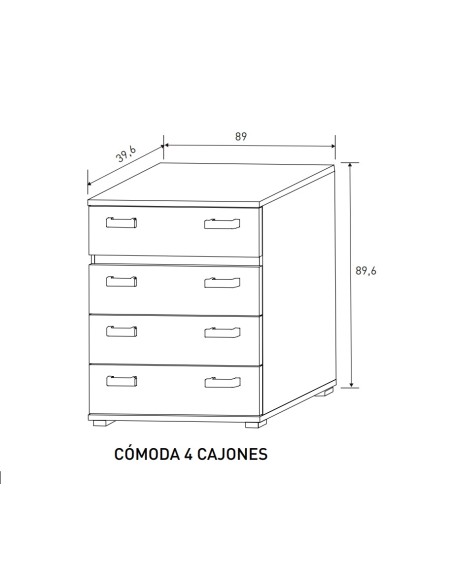 Cómoda de cuatro cajones, fabricada en melamina de alta calidad y disponible en color blanco-grafito. Combinable con el resto de productos de la serie Cabra, que encontrará en nuestra web. No se incluye colchón ni somier ni decoración, los cuales están disponibles en la sección descanso y decoración.
