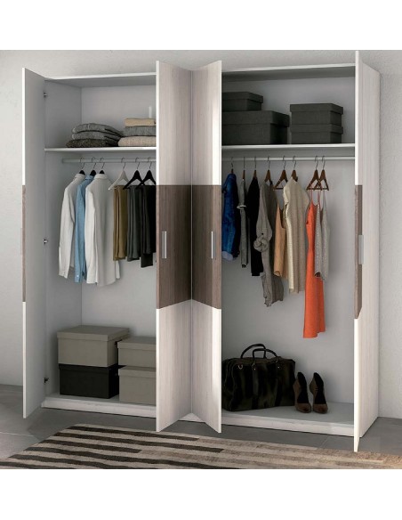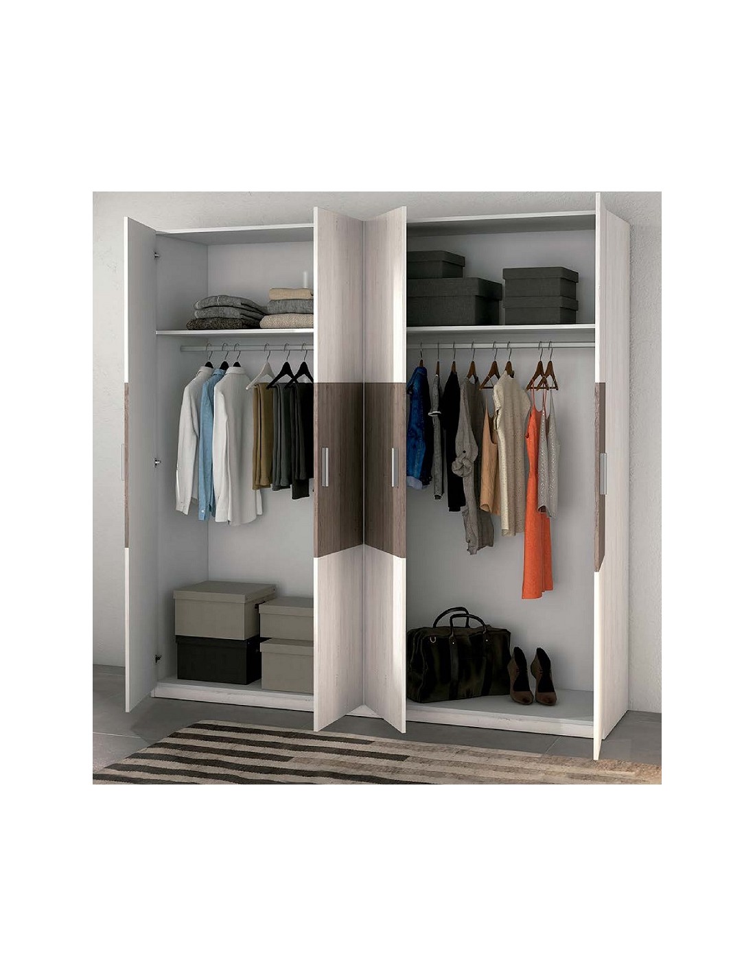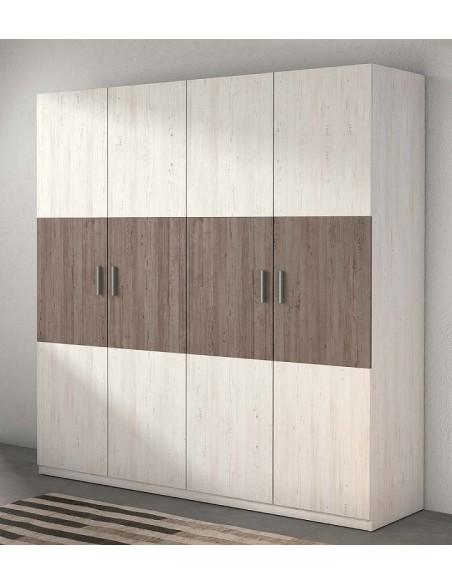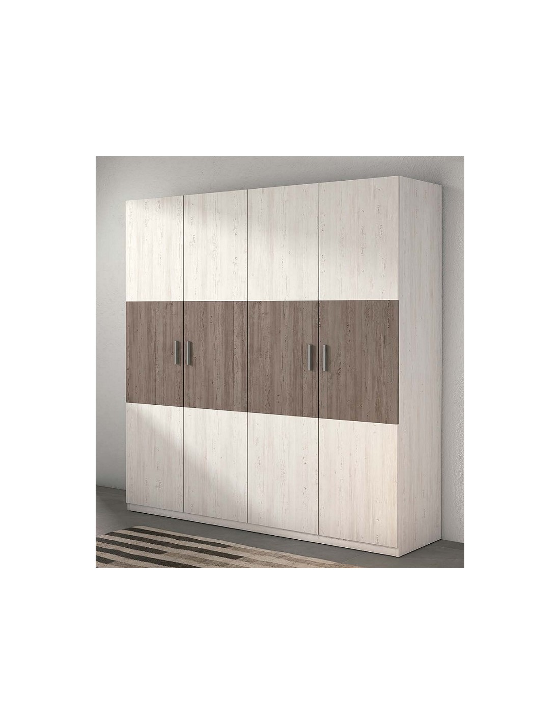 El armario Mika tiene 4 puertas batientes, de 200cm de ancho, es un modelo económico y amplio. Tiene gran capacidad. Incluye dos barras para colgar y dos estantes interiores. Disponible en color ANDERSEN PINO-GRIS. Armario en formato KIT.