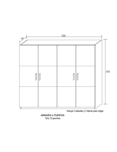 Este armario tiene 4 puertas batientes, está fabricado en melamina contrachapada de buena calidad y herrajes metálicos. Lo cual le convierte en un producto muy práctico y duradero.
