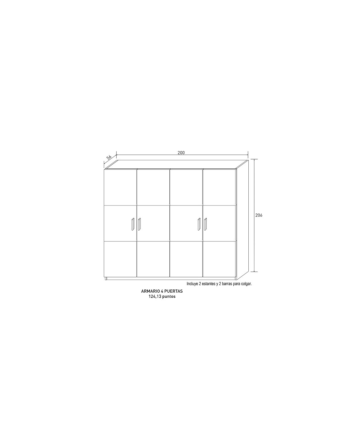 Este armario mide 206cm. de alto y 200cm de ancho, por lo que es perfecto para aprovechar su amplio almacenaje. Incluye dos barras y dos estantes interiores. Disponible en cambrian-blanco. Se sirve en formato KIT.