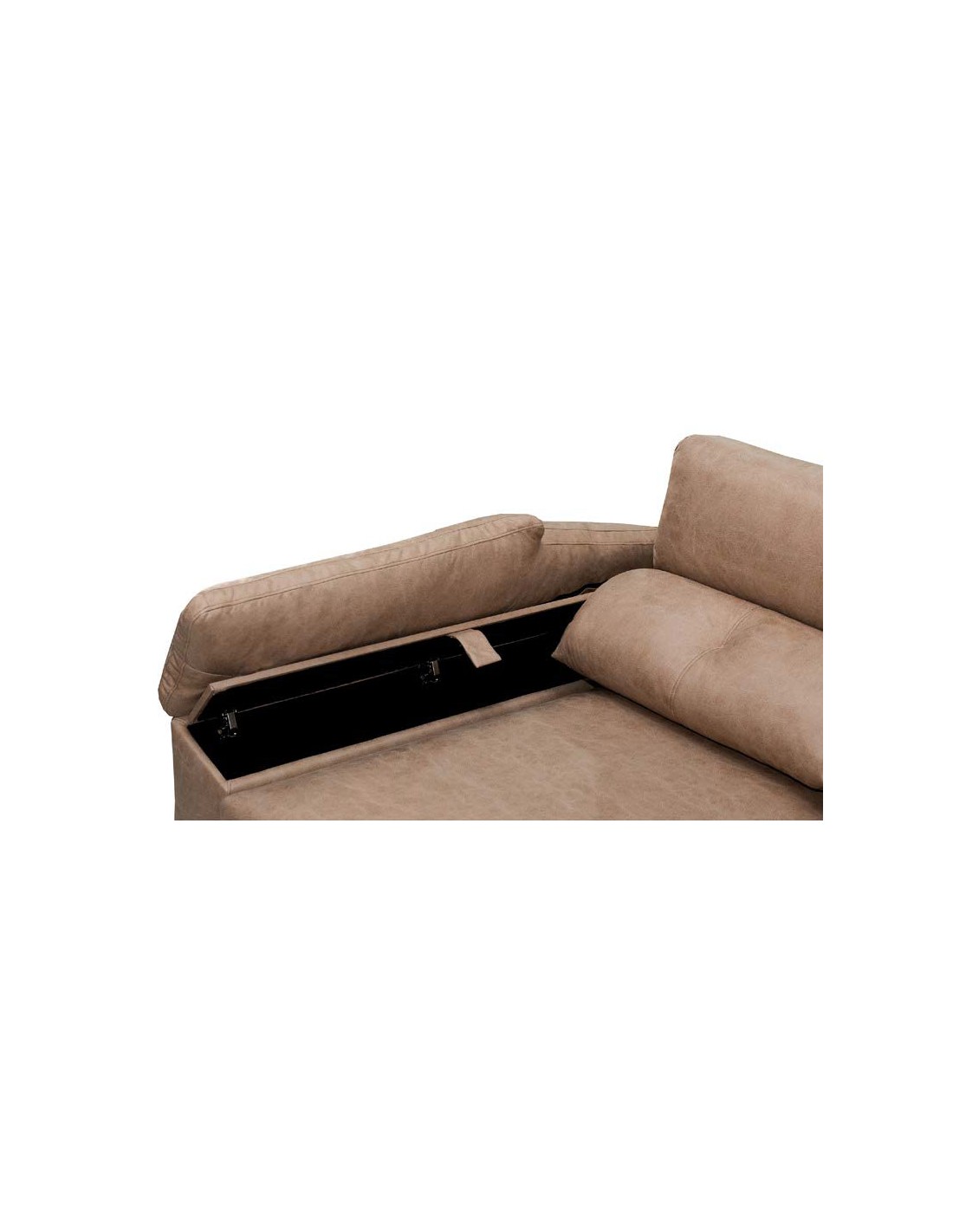 Chaiselongue con arcón. Dispone de muelles ensacado y tratamiento antilíquidos. Respaldos riñoneras y brazos en fibra hueca silinconada. Estructura de madera de pino y asientos de espuma con muelle ensacado densidad 37 kg. Dispone de un brazo corto de 30 cm con brazo siesta almohadilla y 2 taburetes. Brazo chaiselongue de 30 cm con arcón. Las patas tubulares de aluminio tienen una altura 3,5 cm. Cuenta con respaldos reclinables y asientos extraíbles de carro con apoyo al suelo.