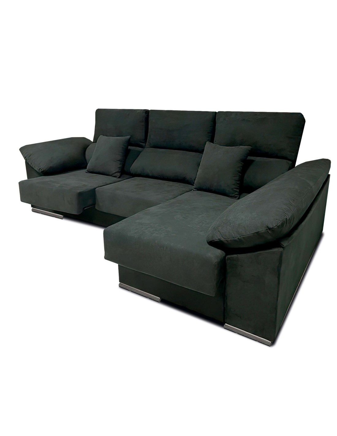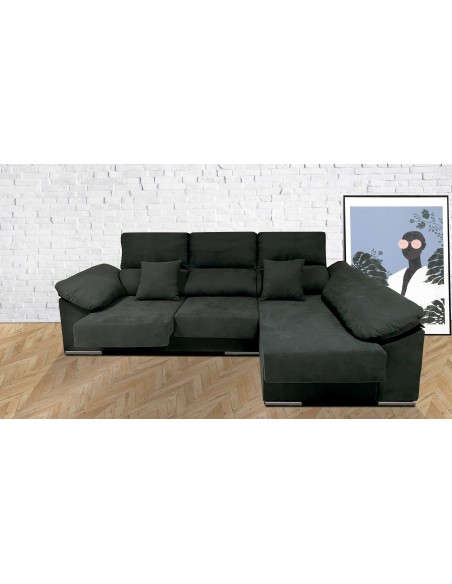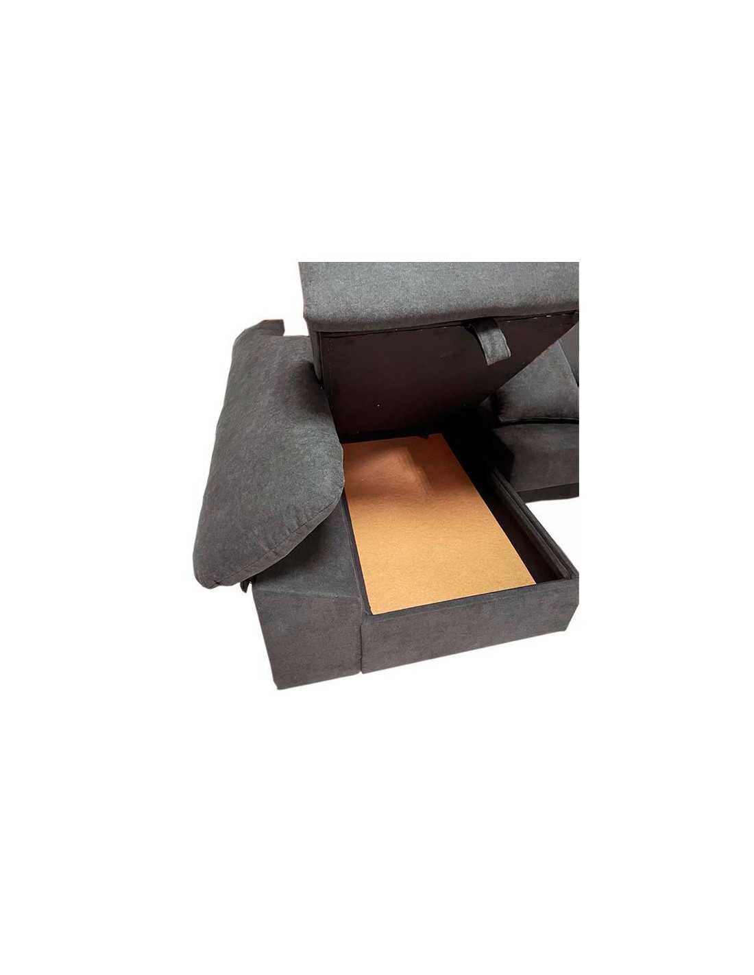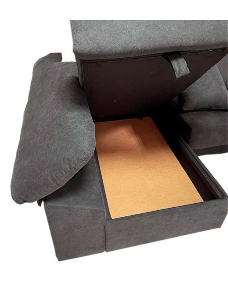 CARACTERÍSTICAS:  Asientos deslizantes enfibrados D-25 kg. con muelle ensacado. Respaldos reclinable. Brazos siesta. Arcón elevable. Dos cojines de decoración. Asientos, respaldos y brazos: desenfundables. Patas cilíndricas metalizadas.