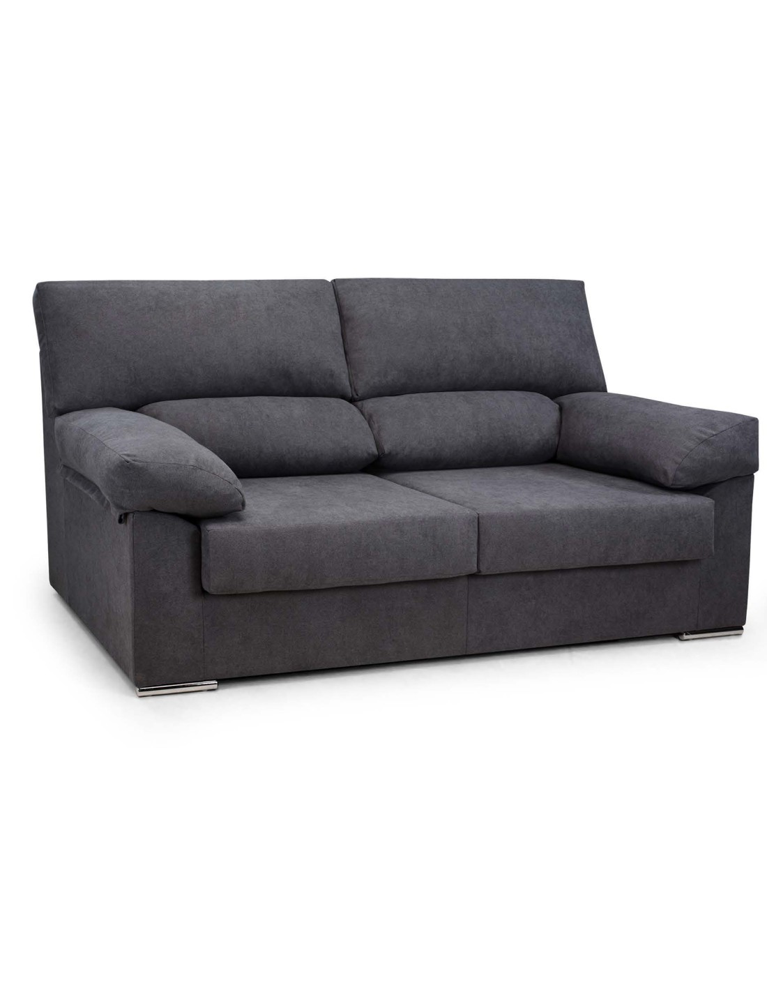 - Estructura de madera de pino y aglomerado de 1ª calidad. Cincha asiento 80 mm 50% y cincha respaldo 60 mm 80%. Cojines asiento bloque de muelles. Respaldos y brazos mezcla fibra y goma. Respaldos, brazos y cojines de asientos desenfundables. Patas delanteras metálicas cromadas.