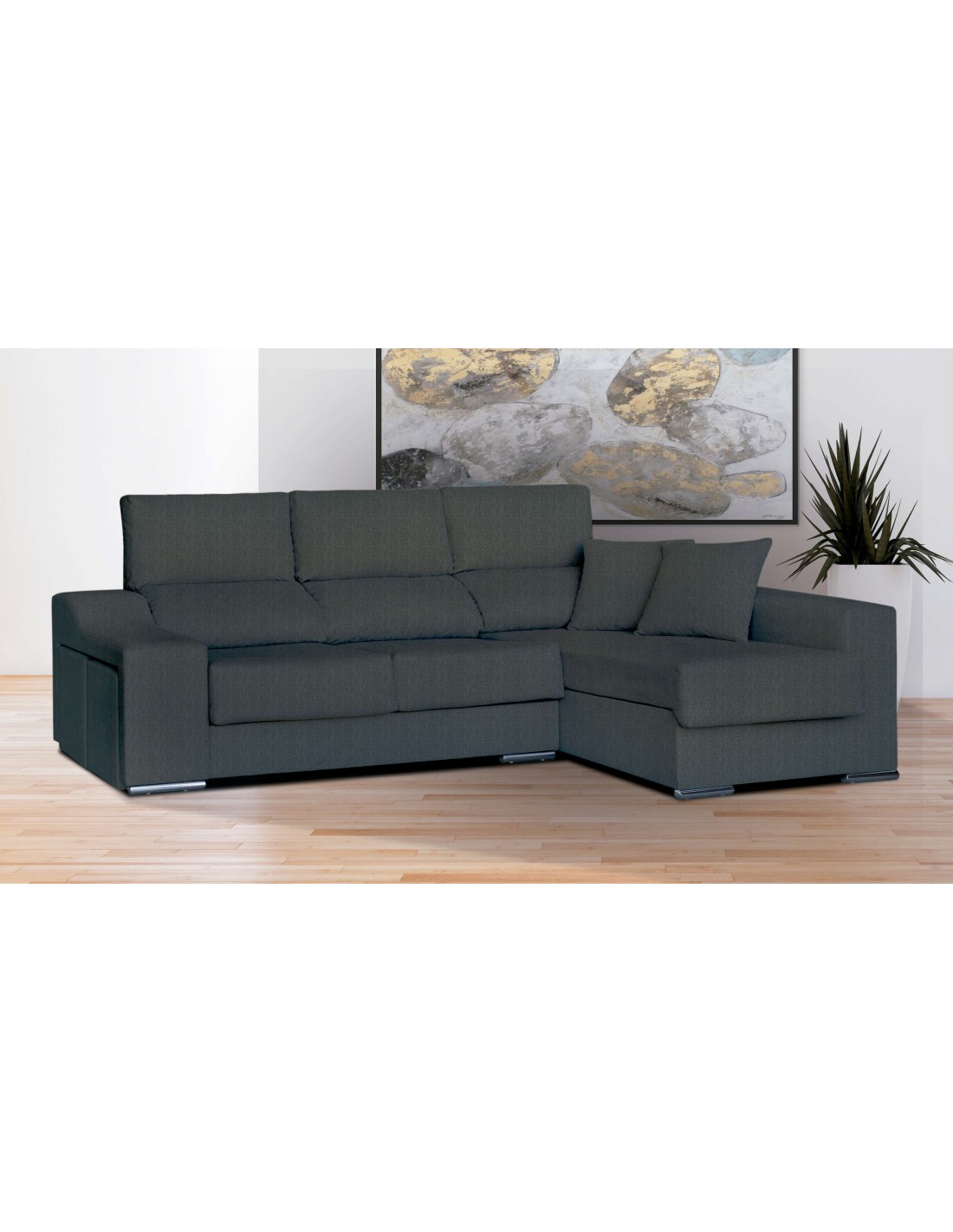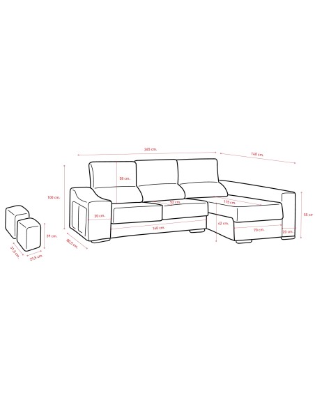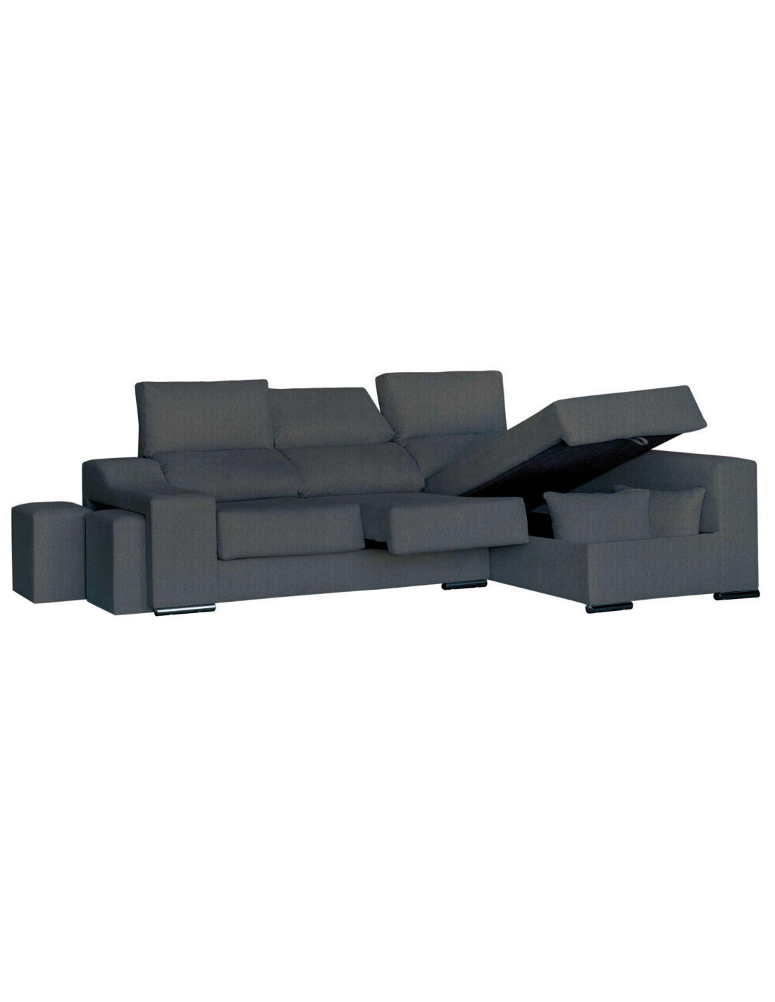 CARACTERÍSTICAS: Chaiselongue con respaldos riñoneras y brazos en copos de poliuretano. Estructura de madera de pino. Asientos de espuma con muelle ensacado. Brazo corto acabado tobogán abierto con 2 taburetes. Brazo largo recto de 20 cm ancho x 55 cm altura x 140 cm fondo. Patas metálicas cilíndricas de 3,5 cm. Respaldos reclinables y asientos extraíbles. Arcón en el módulo chaiselongue. Incluye 2 cojines decorativos.