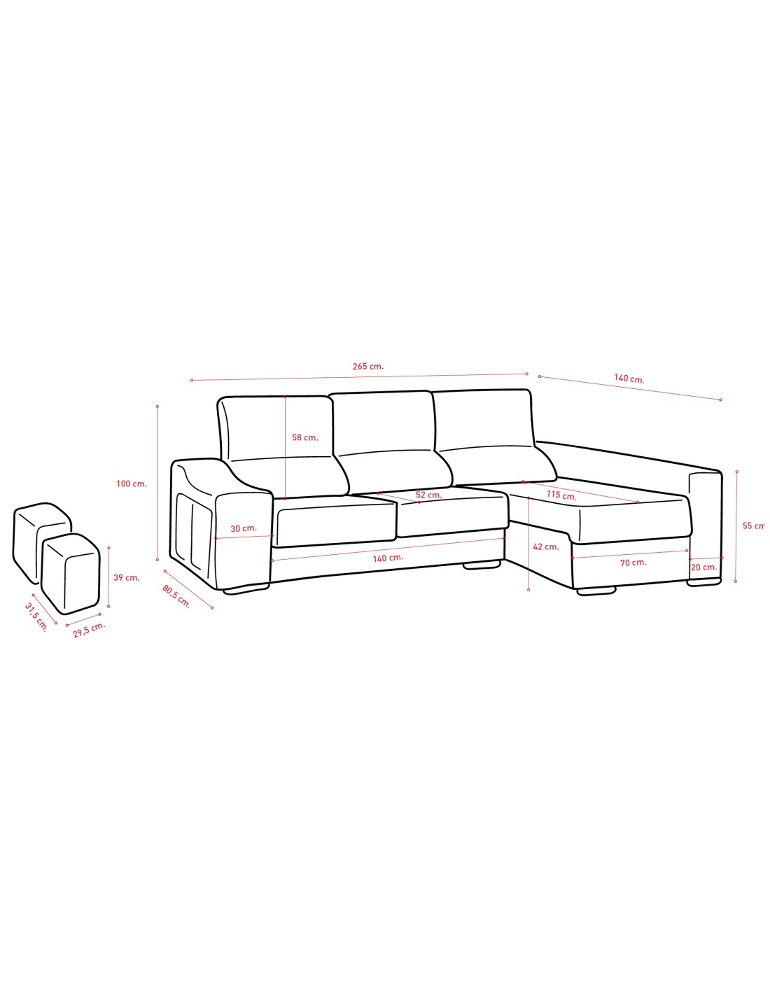 Chaiselongue con respaldos riñoneras y brazos en copos de poliuretano. Estructura de madera de pino. Asientos de espuma con muelle ensacado. Brazo corto acabado tobogán abierto con 2 taburetes. Brazo largo recto de 20 cm ancho x 55 cm altura x 140 cm fondo. Patas metálicas cilíndricas de 3,5 cm. Respaldos reclinables y asientos extraíbles. Arcón en el módulo chaiselongue. Incluye 2 cojines decorativos.
